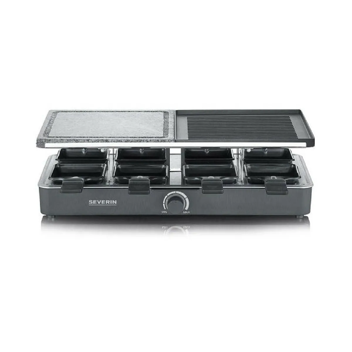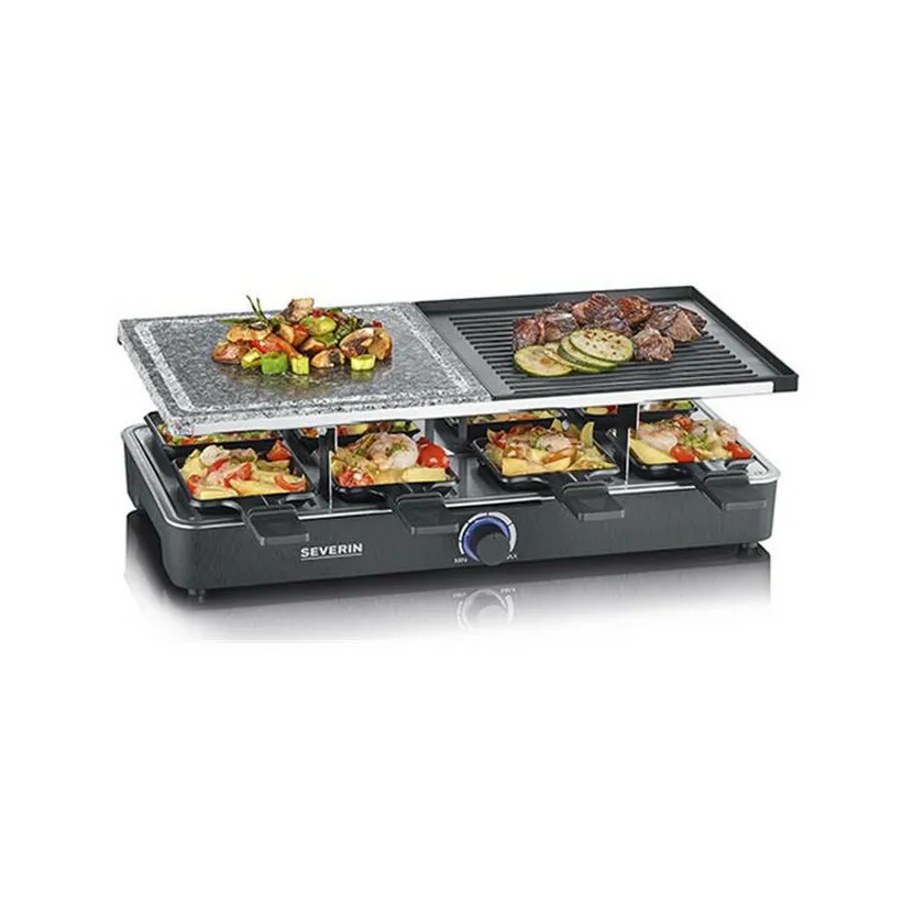 Appareil à raclette avec gril et pierre - 1400 W - thermostat réglable - 8 poêlons antiadhésifs - plaque réversible lisse/strié