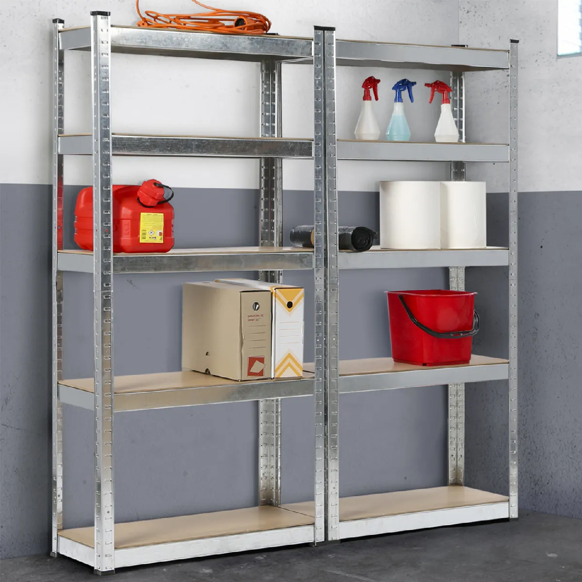 Votre garage devient vite un vrai capharnaüm ? Outils de bricolage, de jardinage, affaires pour vos loisirs... De nombreux objets et outils trouveront leur place sur ce lot de 2 étagères de garage à prix exceptionnel.L'étagère de garage ID Market s'adapte à vos besoins en étant modulable. En effet, chaque étagère est équipée de 5 plateaux, ce qui vous permet de les transformer en 4 étagères distinctes pour former des établis.Grâce à leur structure en acier galvanisé et aux 10 plateaux résistants en bois aggloméré, stockez des éléments volumineux et lourds sans risque. Ces 2 étagères charges lourdes deviendront indispensables pour vous faire gagner de l'espace dans votre garage ou votre atelier.Avec leur capacité ultra-performante de stockage, rangez jusqu'à 875 kg de charge par étagère soit au total 1750 kg ! Adaptées à tous les espaces, posez-les contre un mur ou alignez plusieurs étagères de garage pour délimiter un espace bricolage, jardinage ou autre sans vous ruiner.En plus d'être modulable selon vos besoins, ce lot de 2 étagères est particulièrement simple à monter tout en restant solide et robuste. Le système de clips métalliques et de croisillons assure une stabilité parfaite et un stockage en toute sécurité ! Dimensions du lot de 2 étagères de garage en métal- Dimensions d'une étagère : Longueur 90 CM x largeur 40 CM x hauteur 180 CM- Dimensions du lot de 3 étagères : Longueur 180 x largeur 40 x hauteur 180 CM- Structure en acier galvanisé, épaisseur 0,6 mm- 5 plateaux en bois aggloméré (MDF) par étagère, épaisseur de 4 mm- Capacité max : 175 kg par plateau avec une répartition uniforme des charges - Total : 1750 kg (10 plateaux)- Montage facile et rapide grâce à un système de clips et de croisillons pour une meilleure stabilitéDécouvrez également toutes nos étagères charges lourdes disponibles sur notre boutique en ligne !