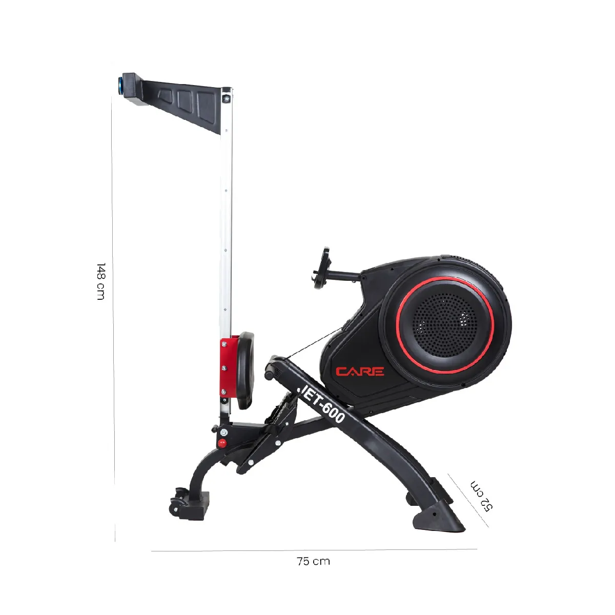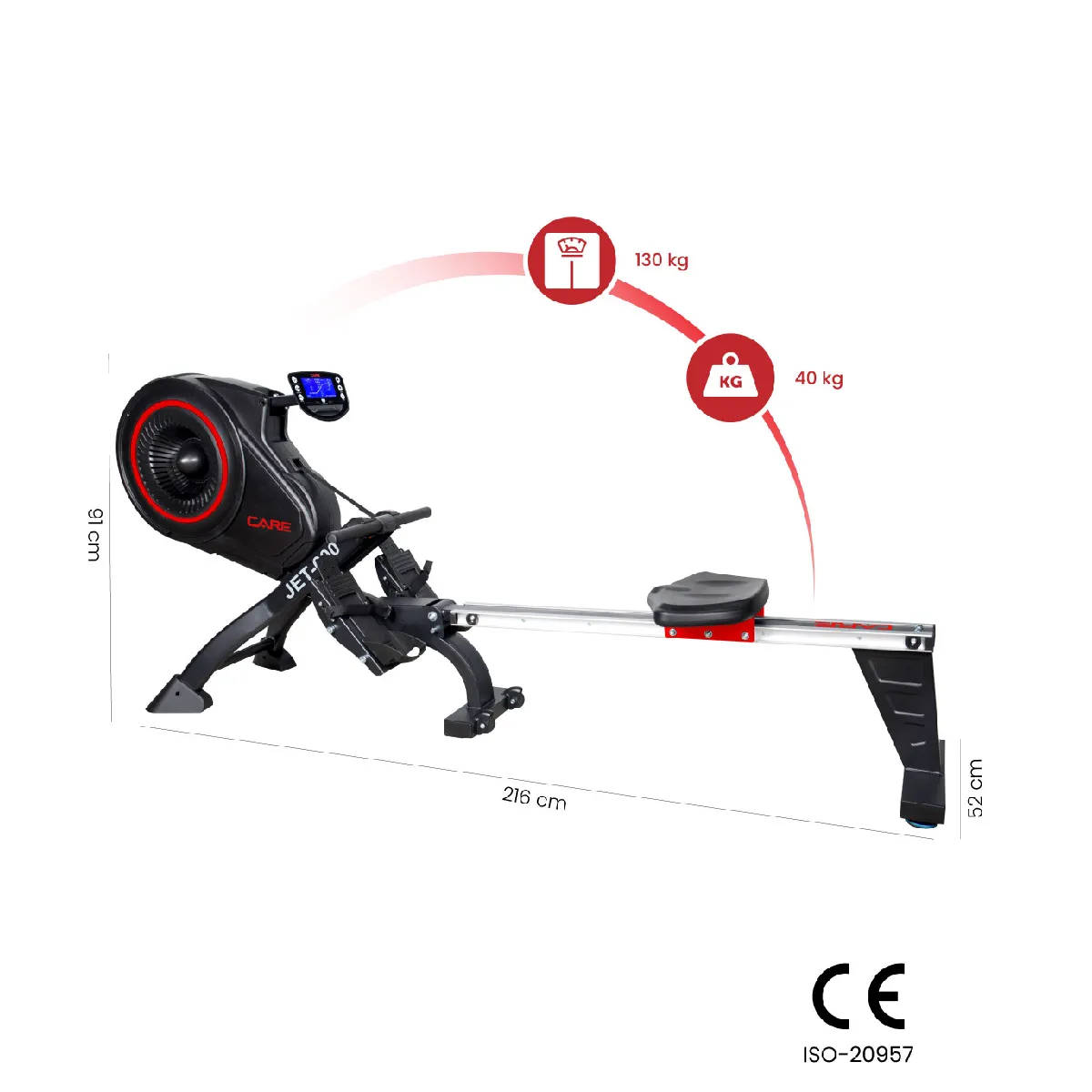 Le rameur Jet 600-2 est équipé d'une masse d'inertie de 8 kg, garantissant un tirage fluide. Ses pédales sanglées et antidérapantes assurent une posture stable et confortable, tandis que le freinage magnétique silencieux offre une utilisation souple. La résistance motorisée est réglable via une console rétroéclairée intuitive.