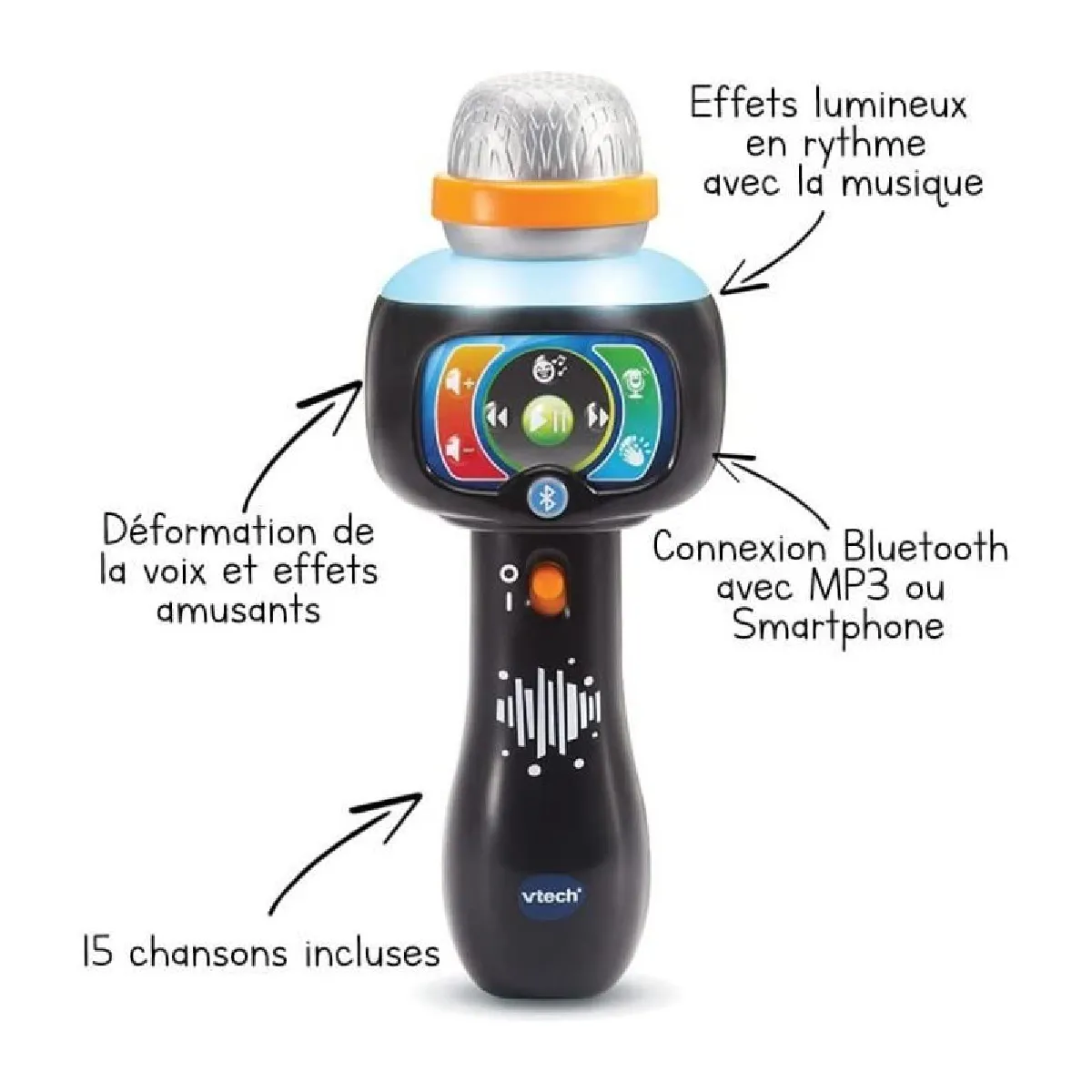 Le micro propose le Bluetooth pour connecter un smartphone ou un lecteur MP3 et chanter sur ses titres préférés en quelques secondes. Grâce à la fonction Magic'voice, il est possible d'atténuer les paroles d'un morceau pour prendre la partie chant. Les effets de déformation de la voix et les sons additionnels offrent des variations amusantes durant chaque performance, tandis que les lumières clignotent au rythme pour renforcer l'immersion. Un réglage de volume intégré permet d'adapter l'écoute au moment et à l'environnement.
