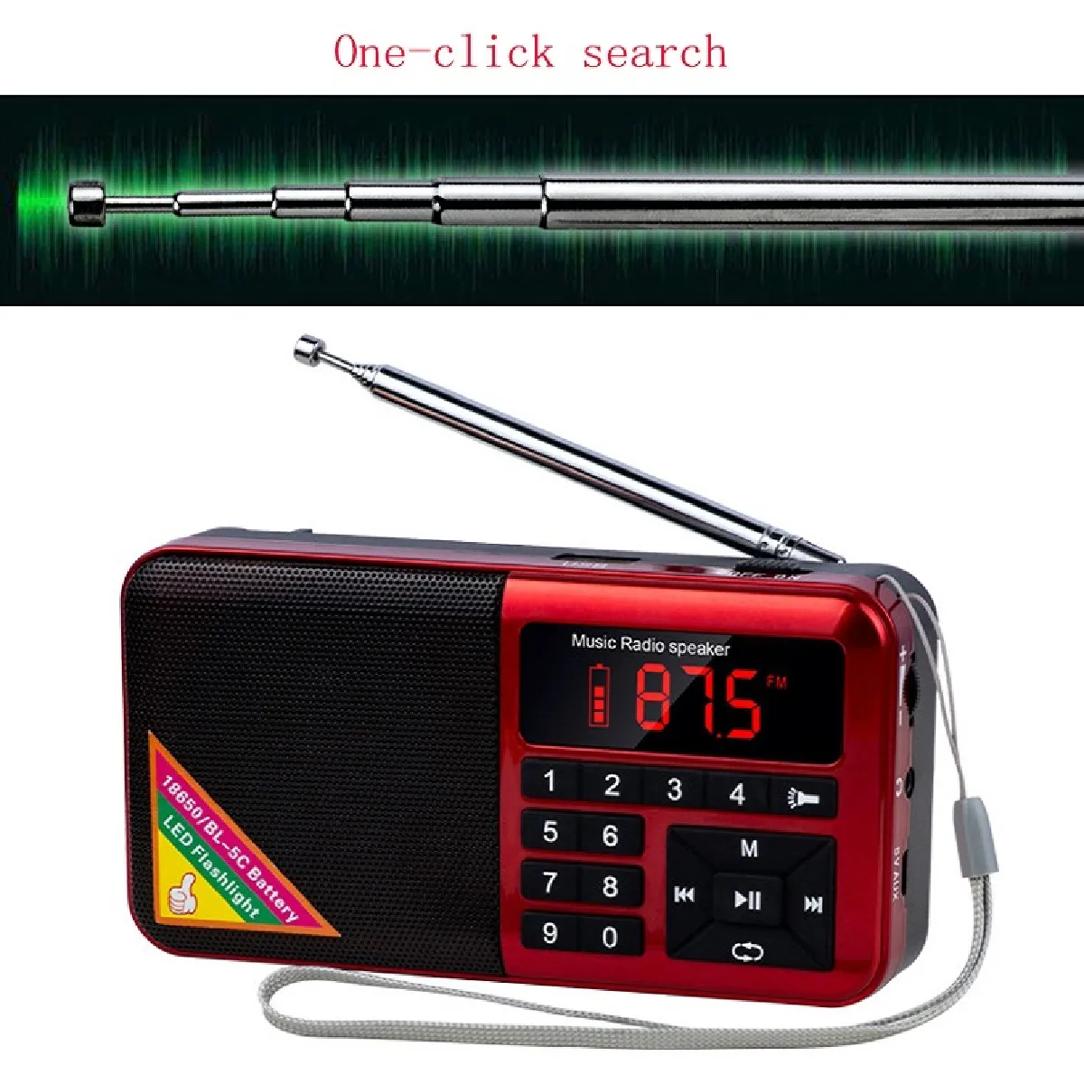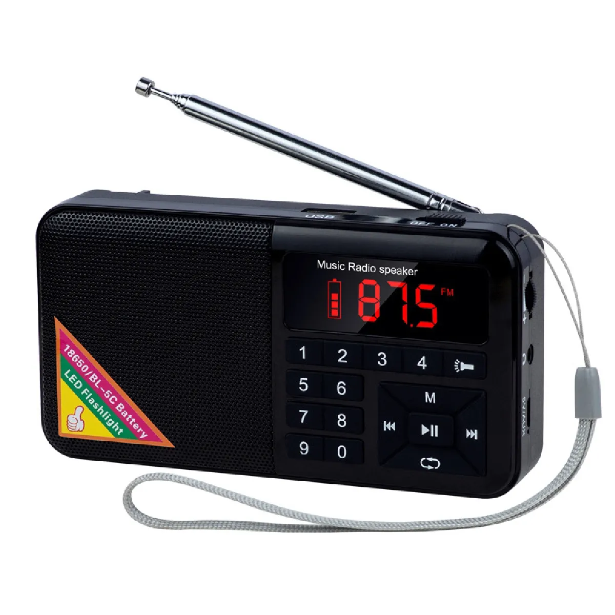 Le récepteur FM couvre 70-108 MHz avec haute sensibilité et recherche automatique pour capter et mémoriser jusqu'à 66 stations. La batterie remplaçable (type 18650 ou lithium 5C, non incluse) soutient un usage nomade, et la fonction lampe de poche large et lumineuse sert d'éclairage ponctuel. Le format portable s'insère aisément dans un sac, avec une tension d'entrée 5 V pratique pour la recharge via interface USB et lecture MP3 intégrée.