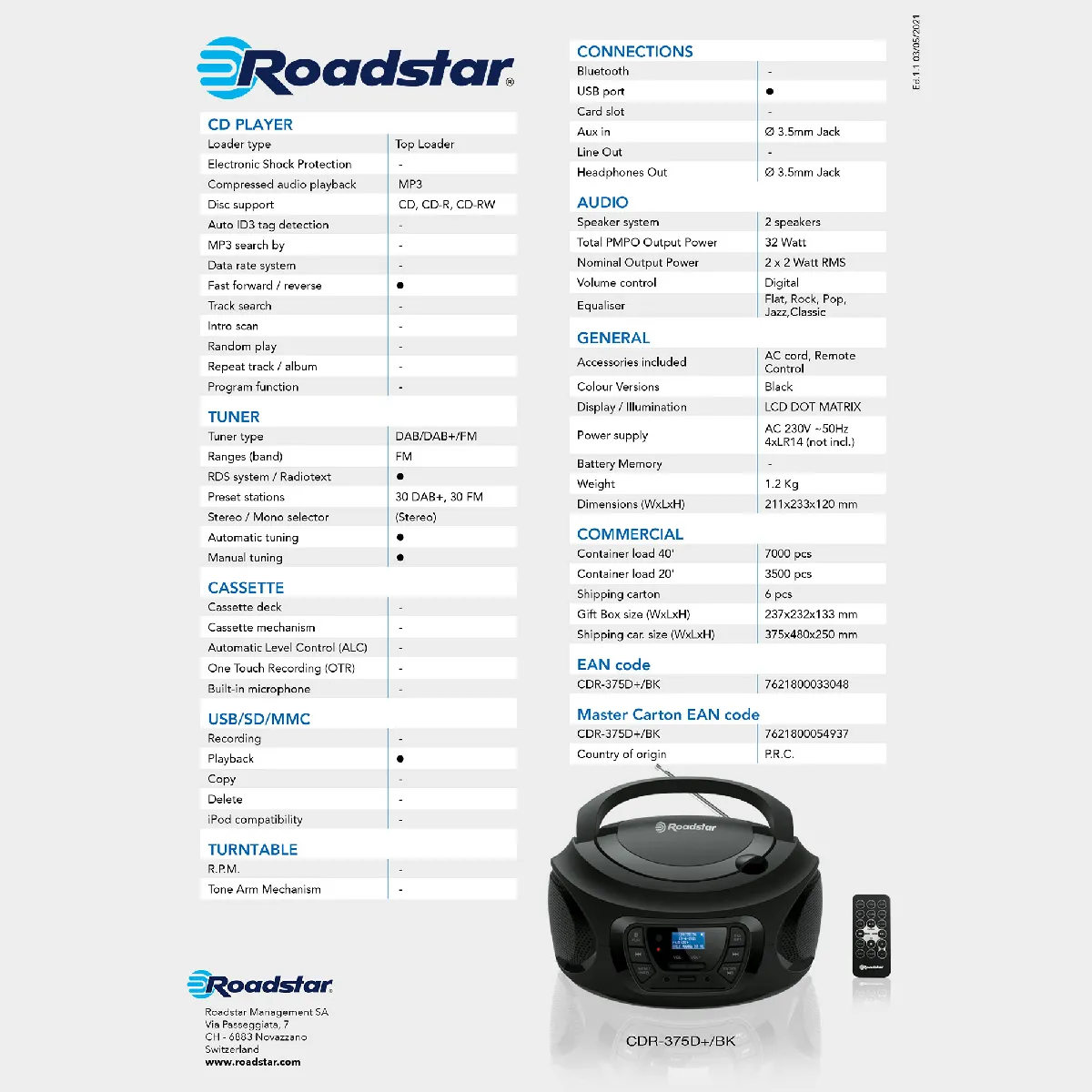 Radio portable DAB/DAB+/FM avec lecteur CD-MP3 et USB - entrée AUX - écran LCD - télécommande - tuner numérique - 30 présélections - stéréo