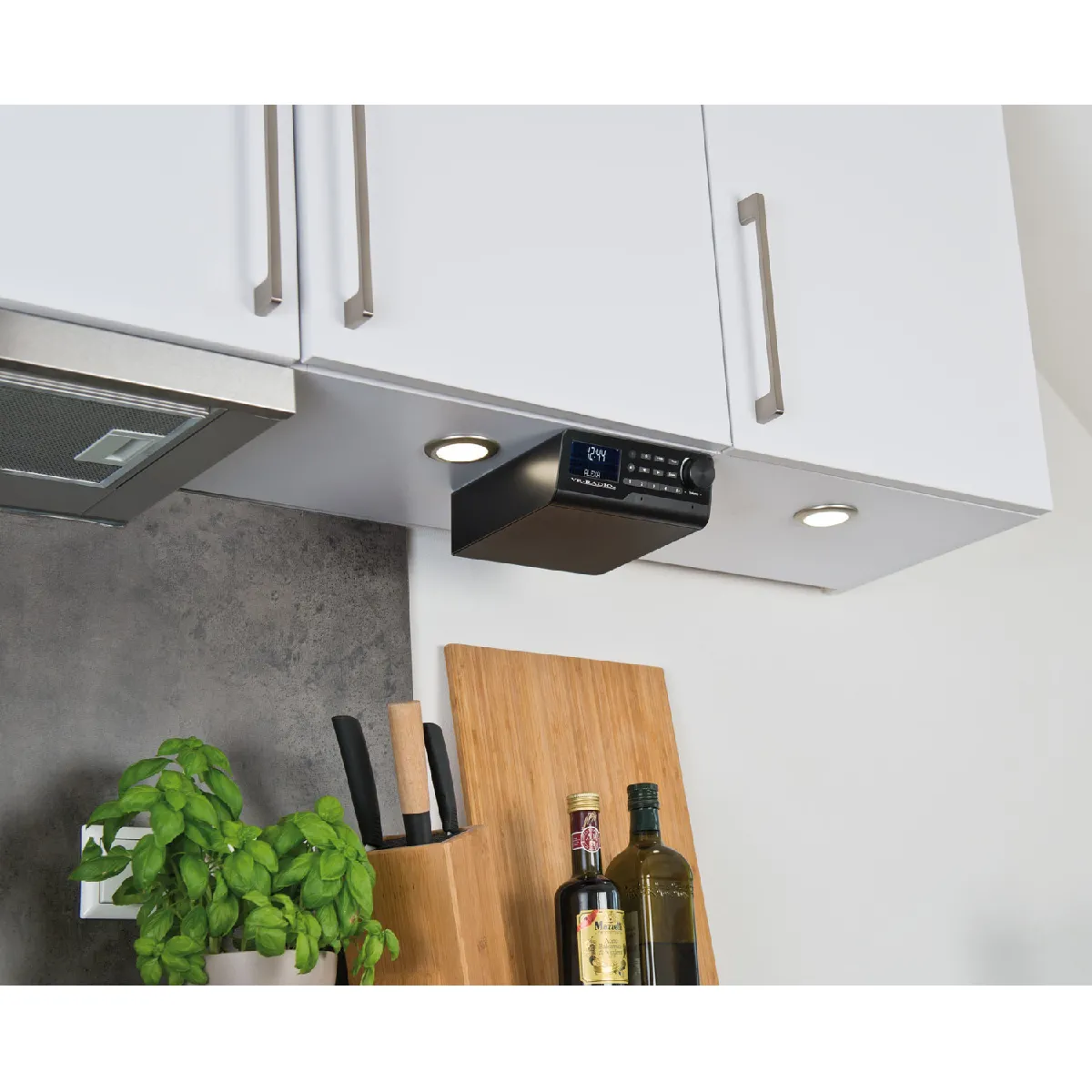 L'installation sous meuble libère le plan de travail et place l'audio à hauteur idéale, avec un écran LCD rétroéclairé affichant clairement titres, heure et informations RDS. La réception DAB+/FM sans interférences avec 20 présélections facilite l'accès rapide aux stations. Le hautparleur 5 W RMS délivre un volume adapté à la cuisine, pour suivre les infos comme pour écouter des playlists. Grâce au WiFi intégré et au Bluetooth 4.1, la diffusion depuis smartphone ou services en ligne reste fluide. Les commandes vocales via Alexa Voice Service offrent un pilotage mains libres pour changer de station, demander la météo ou lancer de la musique.