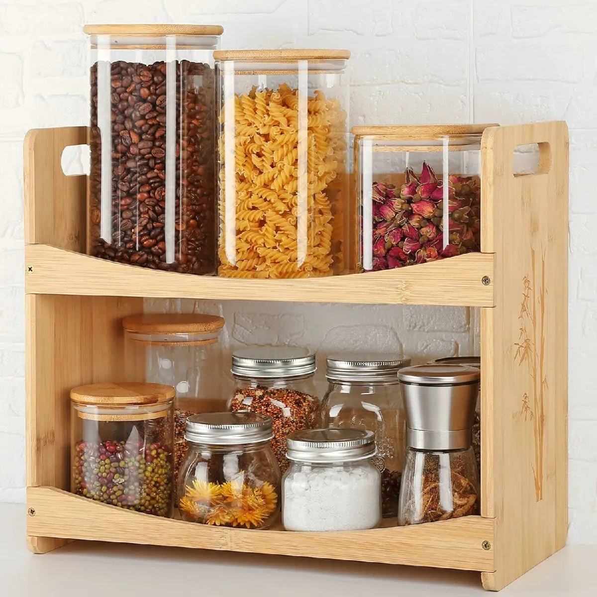 Cette étagère à épices à 2 niveaux optimise l'espace du plan de travail grâce à sa structure en bambou naturel durable et robuste. Avec ses dimensions de 40 x 19 x 35 cm, elle accueille aisément bouteilles et bocaux pour garder les ingrédients à portée de main. Les bords arrondis et les rebords avant et arrière limitent les chutes et protègent les mains lors de la manipulation. Le design de base stable maintient l'ensemble en place sur le plan de travail ou dans un placard, tout en s'intégrant discrètement à différents styles de cuisine.