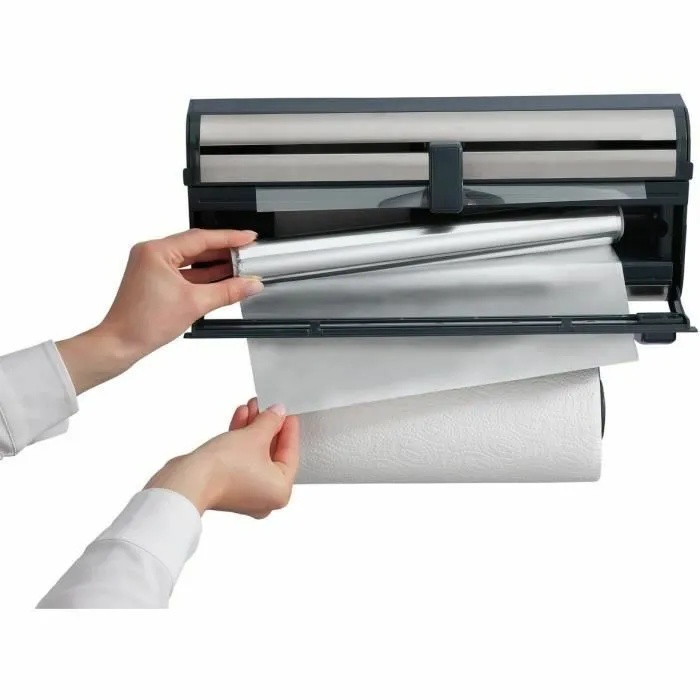 Avec ses trois rangements intégrés, cet accessoire limite l'encombrement et contribue à une cuisine ordonnée. Ses dimensions de 38.5 × 8.5 × 9.4 cm s'intègrent aisément sur un mur libre ou près d'un plan de travail. La surface en acier inoxydable facile à entretenir se nettoie rapidement. L'ensemble assure une manipulation fluide : les films restent tendus, la coupe est précise et chaque rouleau est disponible sans effort, pour un quotidien plus efficient et sans perte de temps.