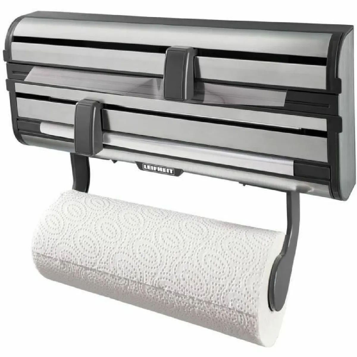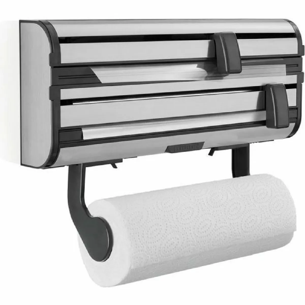 Le boîtier en acier inoxydable gris offre une solution discrète et durable pour regrouper papier essuie-tout, film alimentaire et aluminium au même endroit. Les curseurs de découpe avec lames tranchantes délivrent une coupe régulière, limitant le gaspillage et simplifiant l'emballage des aliments. La fonction de frein pour essuie-tout à une main facilite les gestes rapides lors de la préparation et du nettoyage, même quand le plan de travail est occupé. Sa conception murale optimise l'espace et garde les rouleaux à portée de main, dans une zone protégée et facile d'accès.