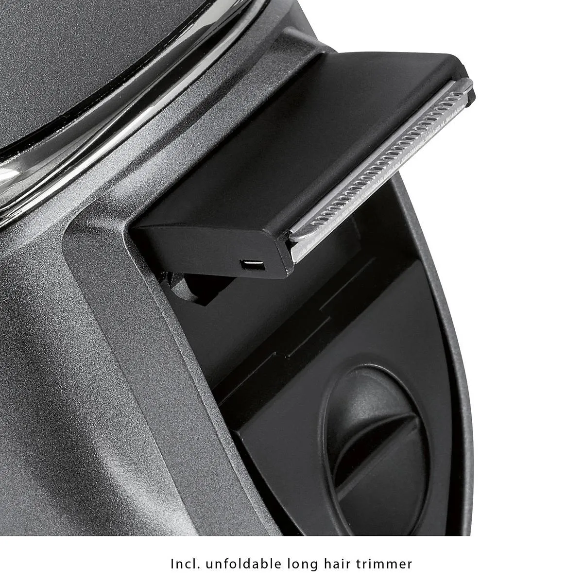 La tête de rasage flexible s'adapte aux contours du visage pour un contact régulier sur les joues, le menton et le cou. La double lame de précision associée à une tondeuse centrale intégrée traite différentes longueurs de poils en un minimum de passages, pour un résultat homogène. Le boîtier protégé contre les jets d'eau IPX5 facilite le rinçage après usage, tandis que l'écran LCD noir et blanc indique le temps d'autonomie restant en minutes. La fonction Direct Drive permet l'utilisation sur secteur, même batterie vide. Un chargeur de voyage 100-240 V et des surfaces antidérapantes apportent une prise en main sûre au quotidien.