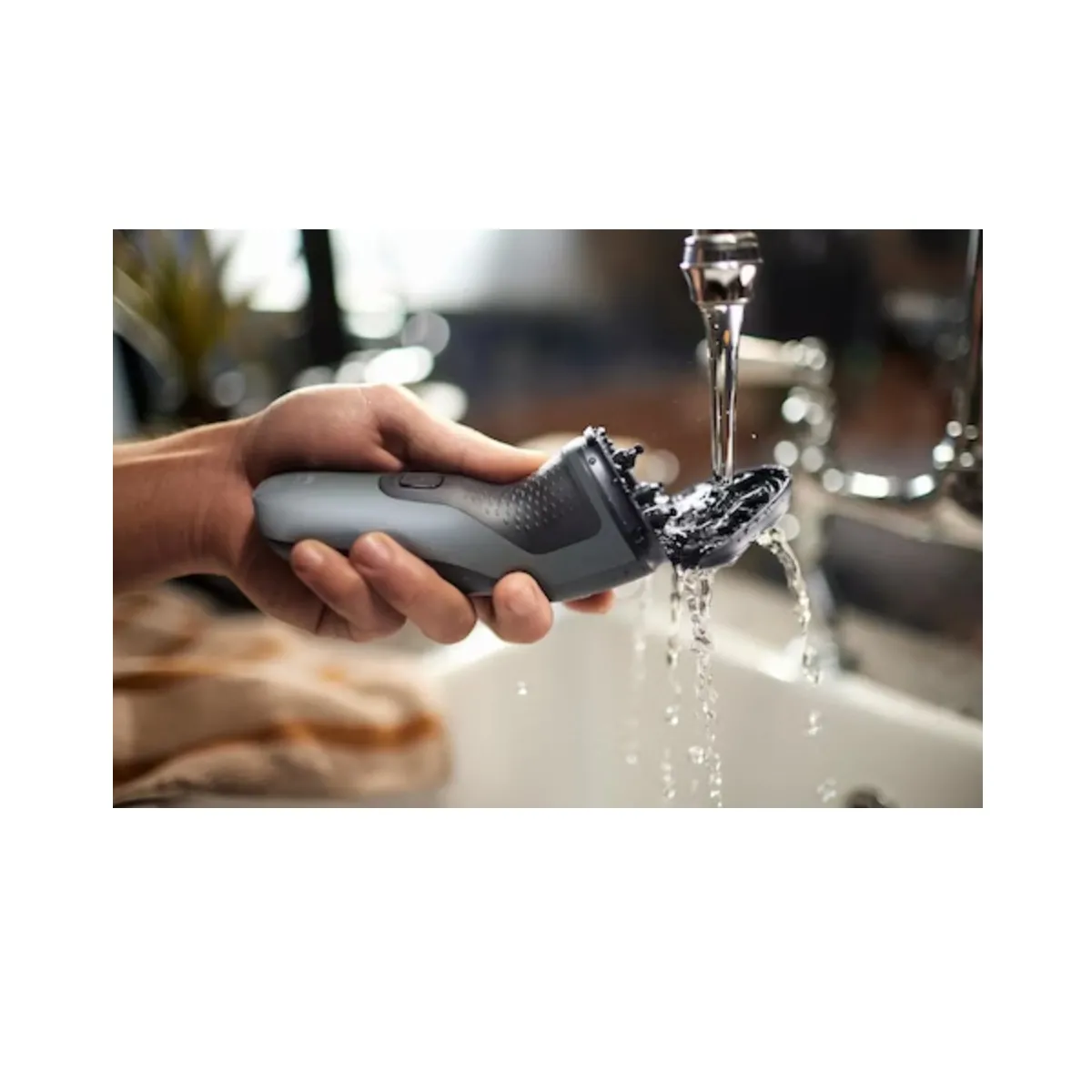 Étanche, l'appareil fonctionne sous la douche pour une routine simplifiée. L'ouverture d'une simple pression permet de rincer l'intérieur efficacement, sans manipulation complexe. Le fonctionnement 100 % sans fil renforce la liberté de mouvement, tandis que l'afficheur indique l'état de charge pour mieux planifier l'utilisation. La couleur gris foncé avec éléments noirs s'intègre discrètement dans la salle de bain et le capot de protection aide à préserver les têtes entre deux rasages.