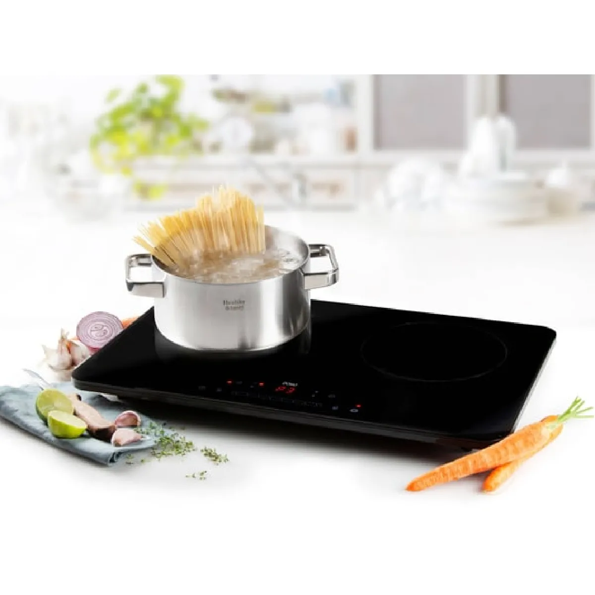 Conçue pour l'induction, la surface vitrocéramique chauffe rapidement la base des ustensiles compatibles, tout en restant simple à nettoyer après usage. Le double foyer, dont le plus grand atteint 20 cm de diamètre, convient à la majorité des poêles et casseroles du quotidien. Avec une puissance totale de 3500 W, la répartition entre les deux zones permet d'alterner entre ébullition et mijotage. Les commandes tactiles frontales restent accessibles, même lorsque deux récipients sont en chauffe.