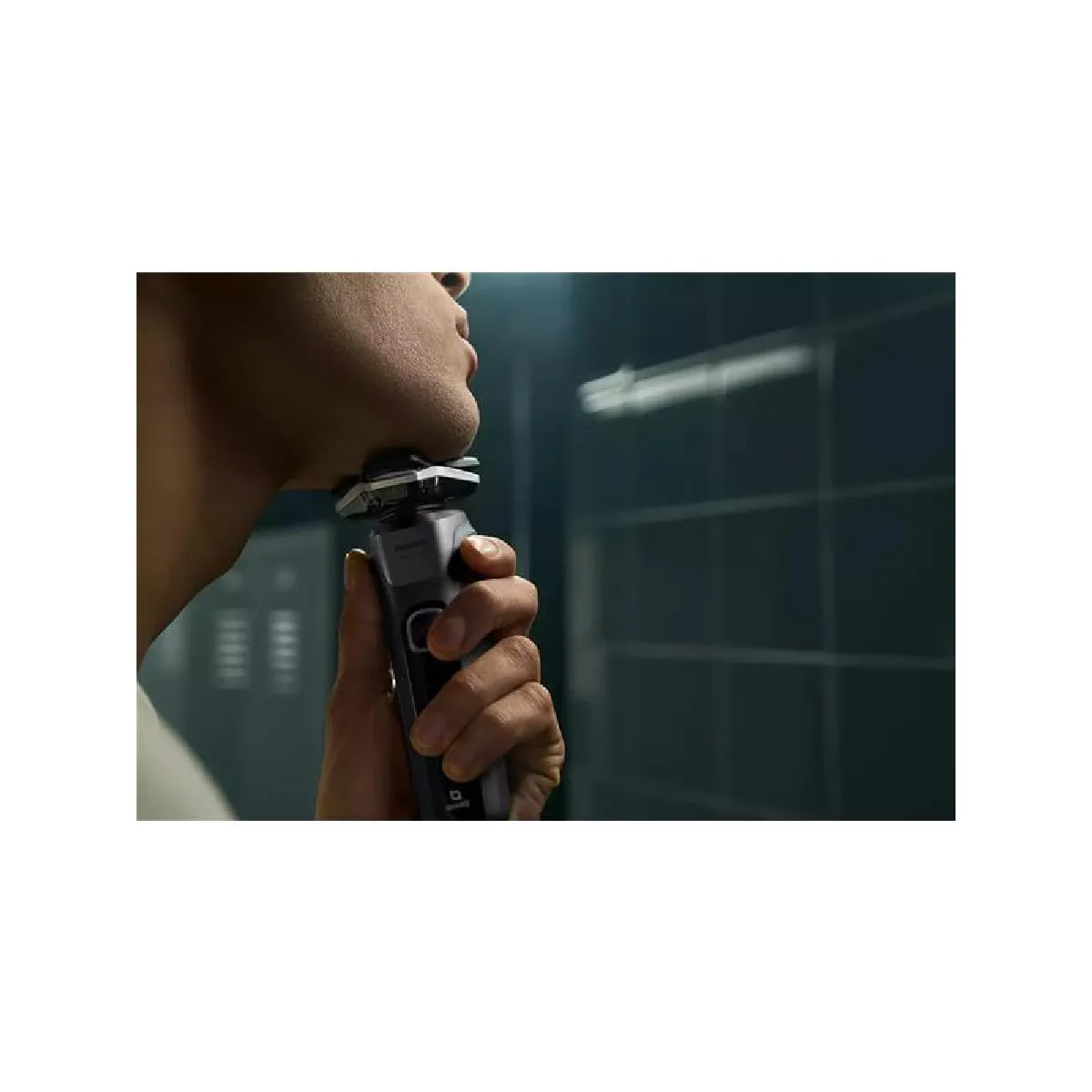 La technologie de détection s'adapte en temps réel à la barbe pour une coupe régulière, même lorsque la densité varie au cours de la semaine. Les têtes flexibles pivotant à 360° suivent les contours du visage afin de maintenir un contact optimal. Les lames SteelPrecision effectuent jusqu'à 90 000 coupes par minute pour réduire le nombre de passages. Utilisable sur peau sèche, avec gel ou sous la douche, ce modèle combine polyvalence et simplicité d'entretien grâce au rinçage à l'eau. L'affichage LED à icônes apporte des repères clairs sur l'état de la batterie et l'entretien, pour des gestes rapides et maîtrisés.
