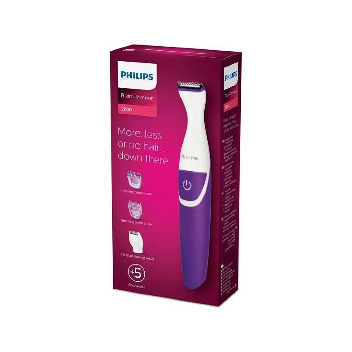 Tondeuse bikini électrique - Tête de précision - Bords arrondis - 2 sabots clipsables - Utilisable à sec ou avec mousse - Tête lavable - Étui et brosse inclus