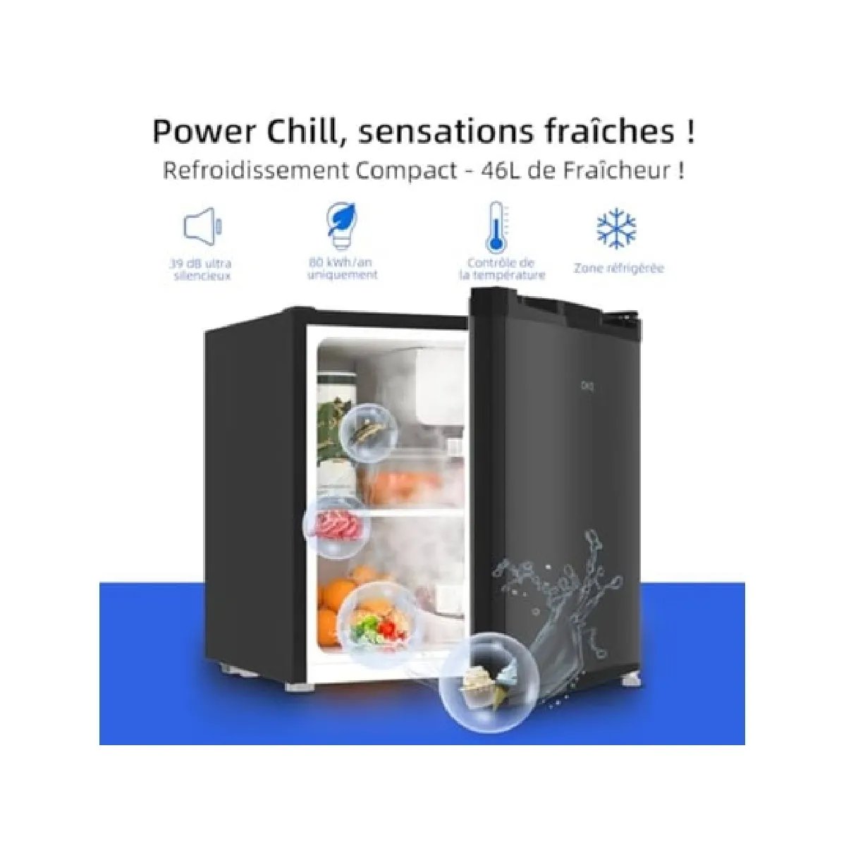 Le volume total net est de 46 litres avec 1 tablette en verre et 2 balconnets de porte pour organiser les aliments et les boissons.