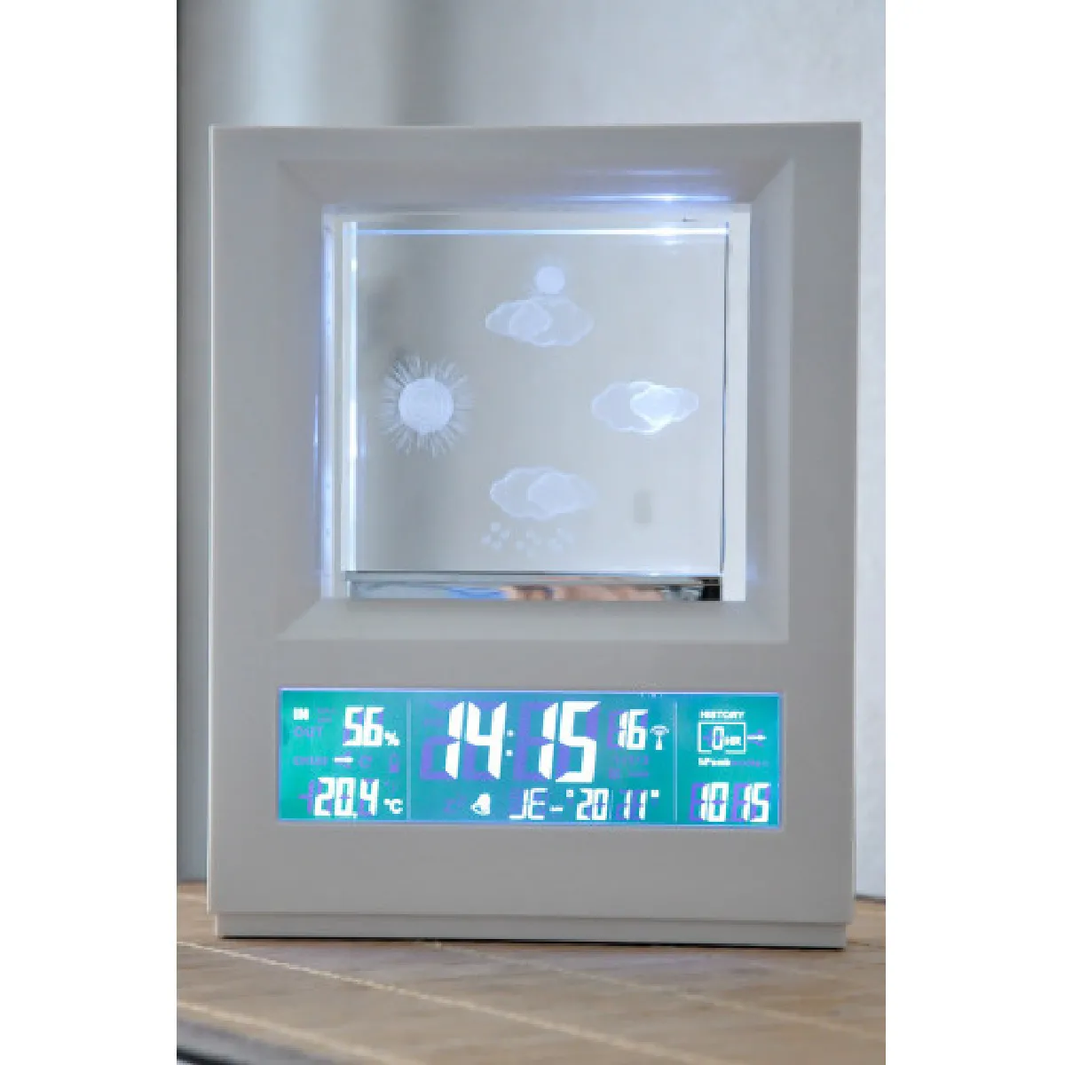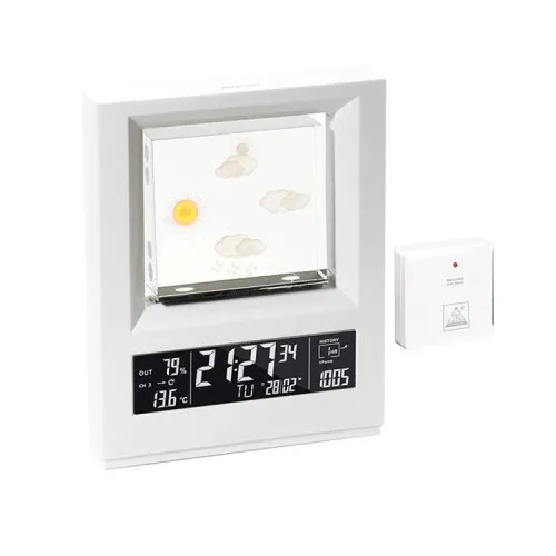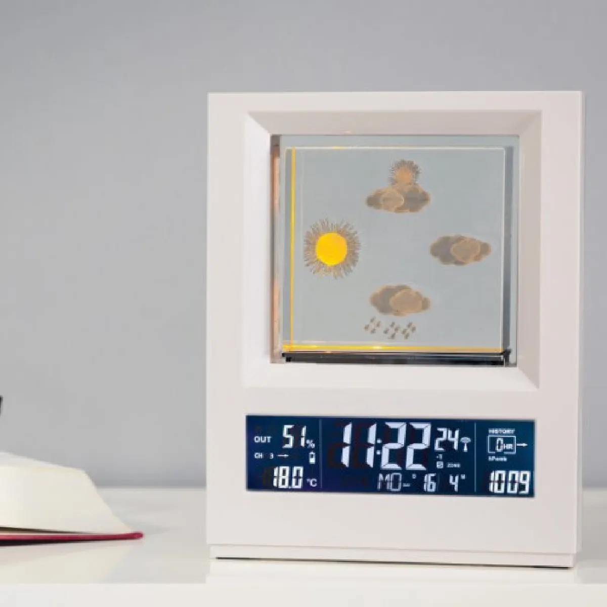 Le grand écran à cristaux liquides met en avant une présentation synthétique des prévisions et des mesures pour faciliter la lecture à distance. Les symboles météo s'affichent dans un bloc de verre, offrant une visualisation intuitive des tendances à venir. Grâce au baromètre, à l'hygromètre et aux capteurs de température, les informations essentielles sont disponibles en continu pour anticiper les variations climatiques.