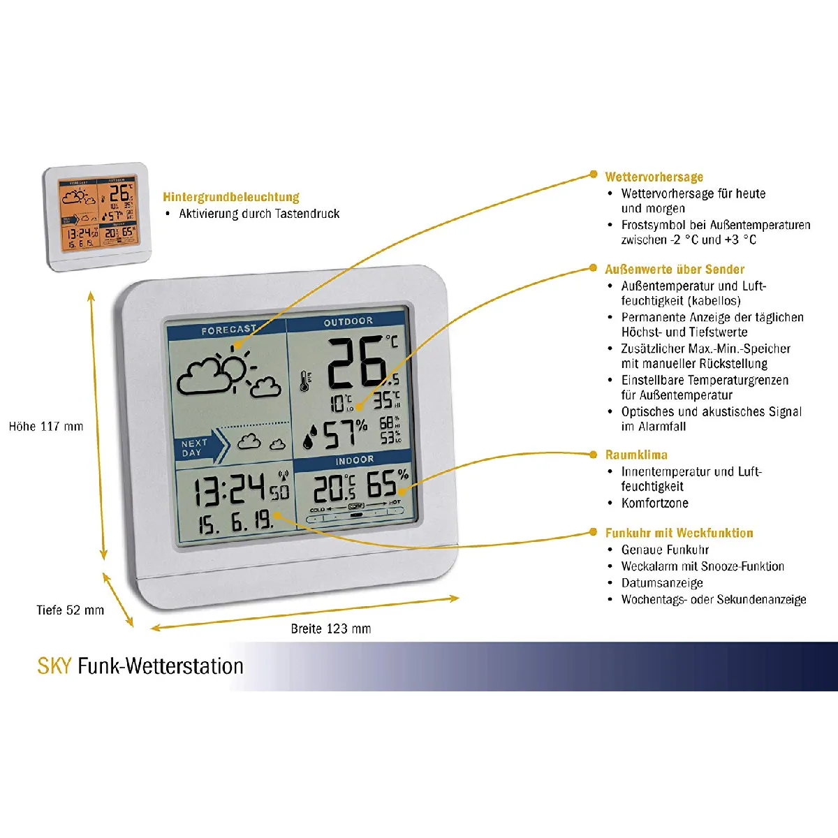Surveillez d'un coup d'il la température et l'humidité intérieures et extérieures tout en profitant d'une horloge radiopilotée DCF77 précise. Cette station météo compacte en boîtier blanc fonctionne sans WiFi ni Bluetooth et s'adresse à ceux qui souhaitent des données fiables au quotidien. Grâce à un affichage numérique clair, elle indique la date, le jour de la semaine et des valeurs Max/Min utiles. Une prévision météorologique sur 2 jours aide à planifier les sorties, tandis que l'alarme de gel avertit en cas de risque. L'ensemble s'utilise en intérieur et extérieur avec un capteur thermo/hygro sans fil.