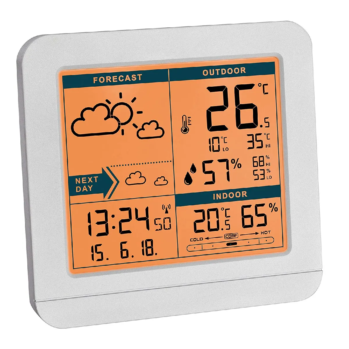 Le récepteur DCF77 ajuste automatiquement l'heure pour une mesure du temps fiable et sans réglages manuels. L'affichage numérique réunit les informations clés : température, humidité, date et jour, complétés par des valeurs Max/Min pour suivre les variations. Le mode confort permet d'évaluer rapidement le climat intérieur pour aérer ou humidifier au bon moment.