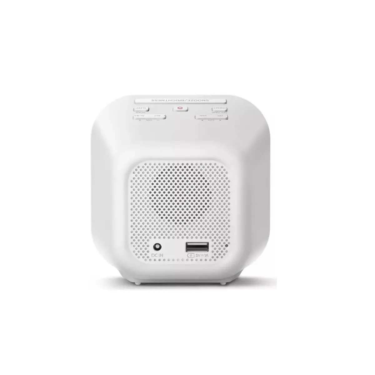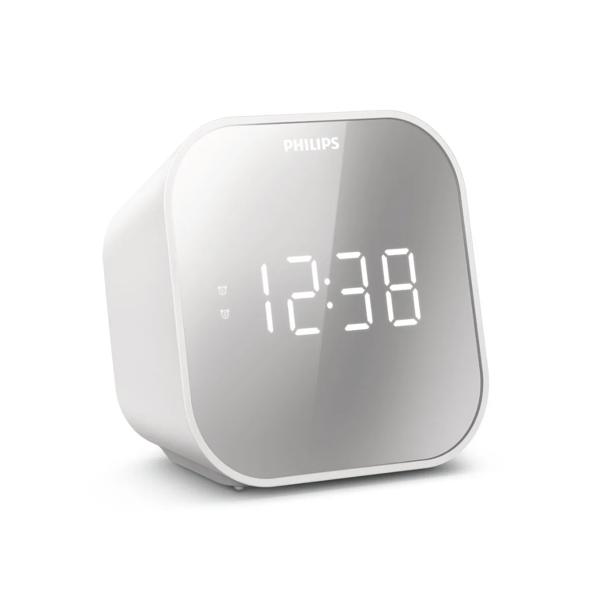 Pensé pour la table de nuit, ce modèle intègre une prise USBC dédiée à la recharge d'un appareil externe pendant la nuit. L'affichage LED propose un contrôle de la luminosité pour s'adapter à la pièce. En cas de coupure secteur, la sauvegarde par 2 piles AAA préserve les réglages essentiels. Le boîtier compact de 11 x 11 x 7.5 cm et 220 g, en coloris blanc avec façade effet miroir discrète, facilite l'intégration dans des espaces réduits.