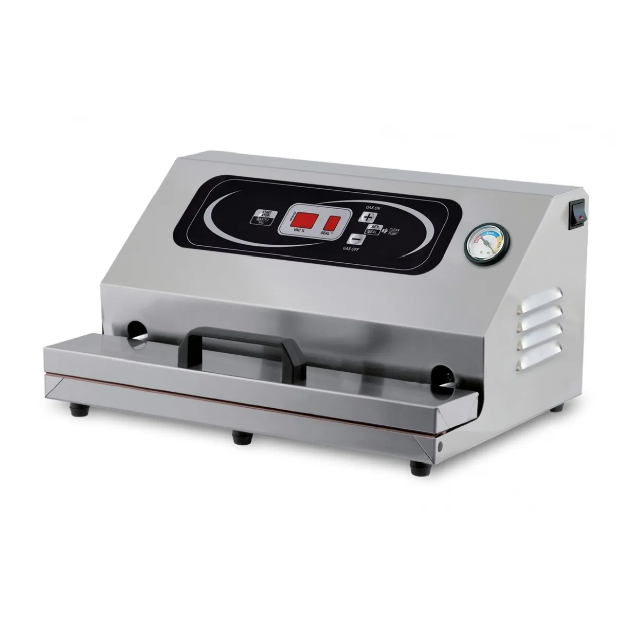 Sous videuse professionnelle automatique, en inox, avec une pompe à huile représente le top de la machine pour mettre sous vide à aspiration extérieure. Barre de soudure de 500 mm et nécessite des sacs sous vides gaufrés. Machines à emballer sous vide automatiques, digitales en acier inox, avec pompe à huile. Elles représentent le top de la gamme des sous videuses à aspiration extérieure. La structure super renforcée et l'automatisation du cycle sont déjà prévus de série; les pompes disposent d' une lubrification forcée, ce qui le rend utilisable même pour cycles de travail continus. Elles sont en mesure de travailler en sachets, récipients et sachets multiples en garantissant excellents résultats pour toutes les typologies de produits. la Série PROFESSIONAL PLUS, née au début des années '80, la gamme est arrivée à la 3' série de production, et représente une importante référence de marché, depuis des années.Structure : inox Dim. d'encombrement : 520 x 380 x 210 H Barre de soudure : 500 mm Pompe du vide : Q = 6/7.2m3/h-HUILE Poids : 23 kg Puissance : 500 w Voltage : 230 V/50-60 HzCette machine nécessite des sacs sous vides gaufrés..
