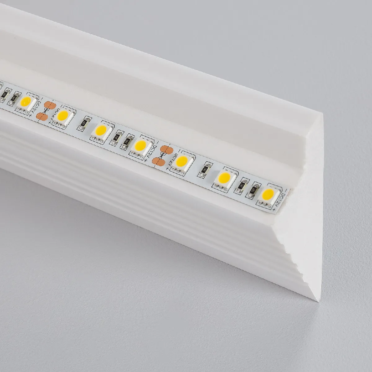 La moulure pour Ruban LED est faite de polymère extrusioné à haute densité qui est résistante aux chocs et à l'eau. En raison de sa dureté particulière, ce matériau est idéal pour les plinthes et les moulures de plafond.