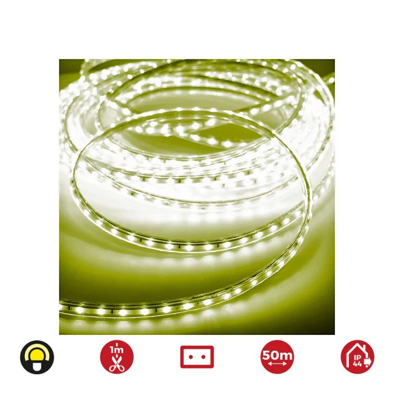 Idéal pour baliser un parcours, souligner un meuble ou créer une ambiance, ce ruban offre une lumière jaune continue sur 50 m avec une densité de 60 LED par mètre. Sa consommation de 4,2 W par mètre aide à maîtriser l'énergie tout en apportant une visibilité douce. Conçu pour une installation simple, il fonctionne sur 220-240 V avec prise EU et ne requiert aucune application ni assistant vocal. La classification IP44 pour un usage intérieur et extérieur permet une pose à l'abri des projections directes d'eau, sur corniches, vitrines ou terrasses protégées.