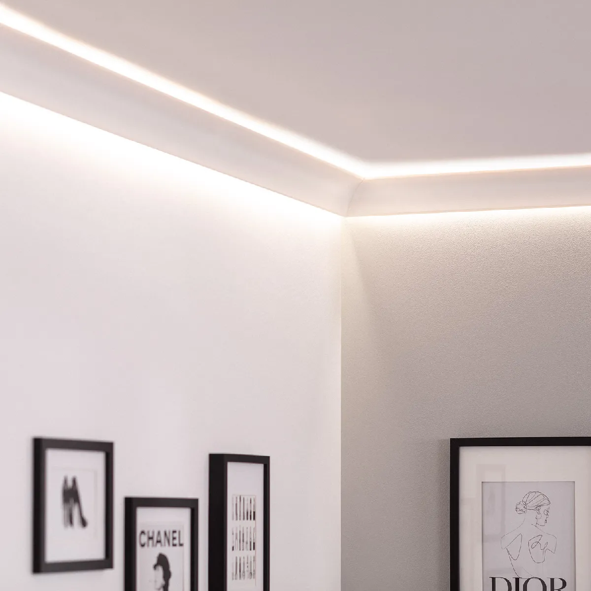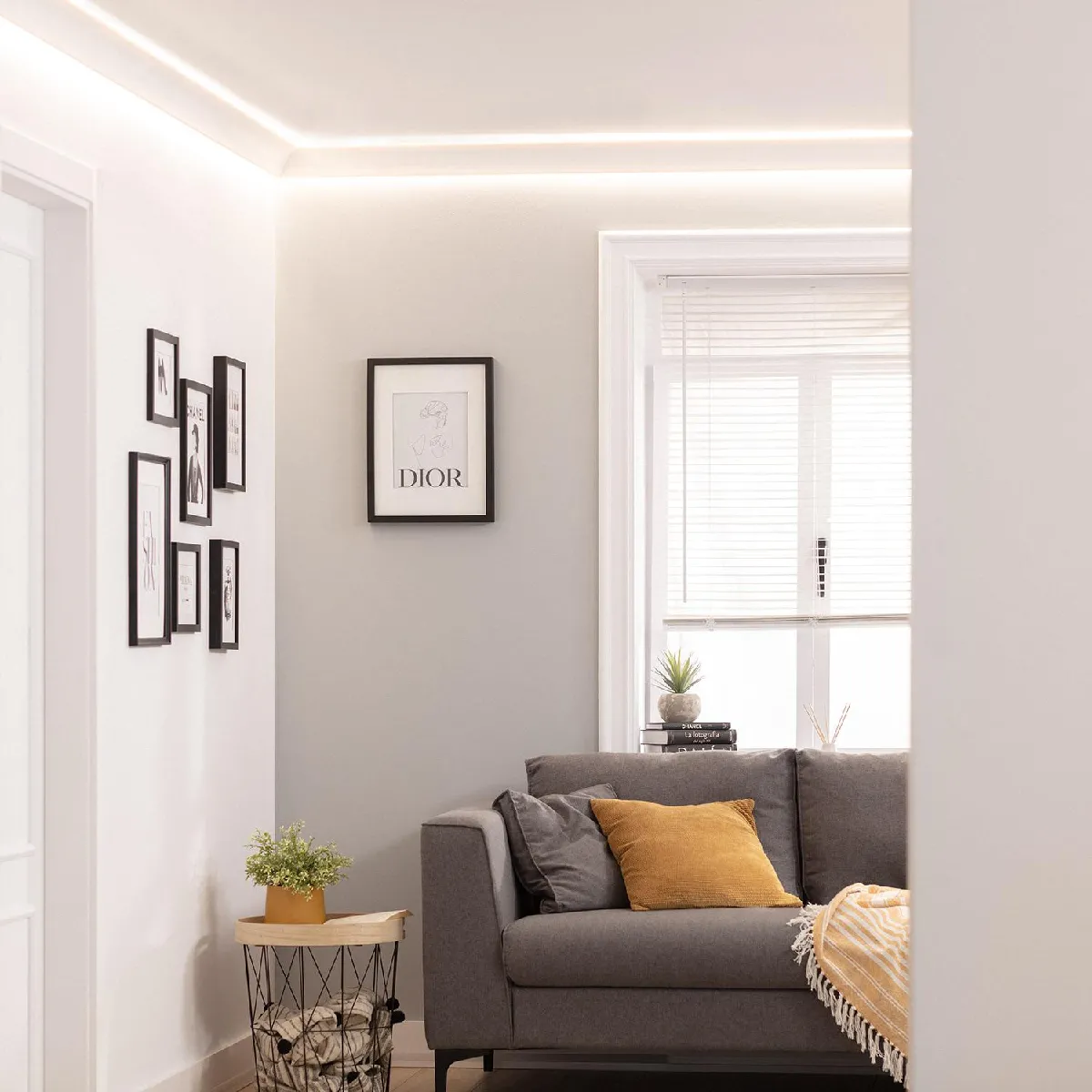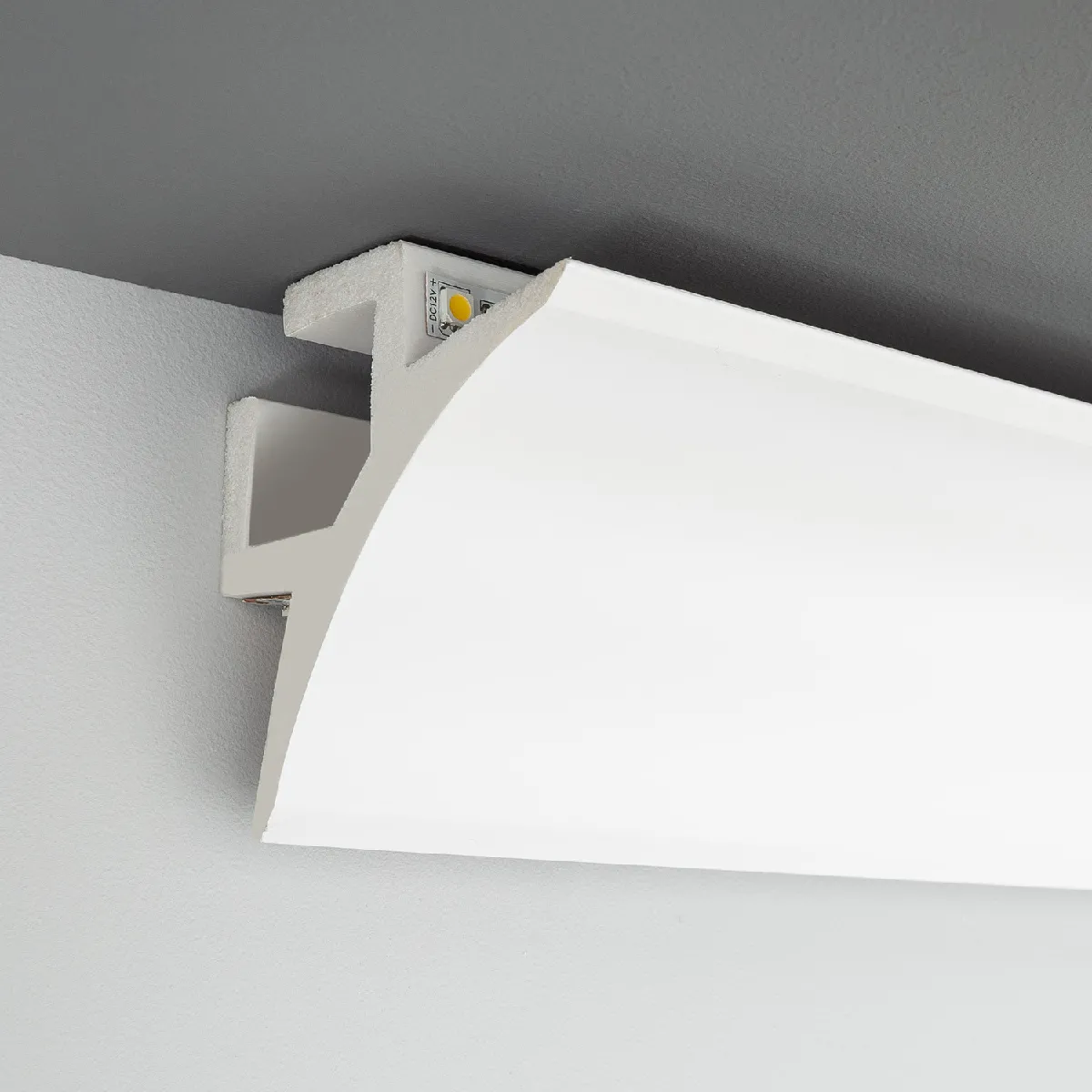 Moulure décorative pour rubans LED - Profil arc - Éclairage indirect diffus - Polymère haute densité - Résistante aux chocs et à l’eau - Pose rapide et peignable - Pour intérieur