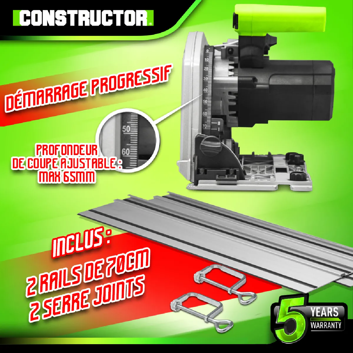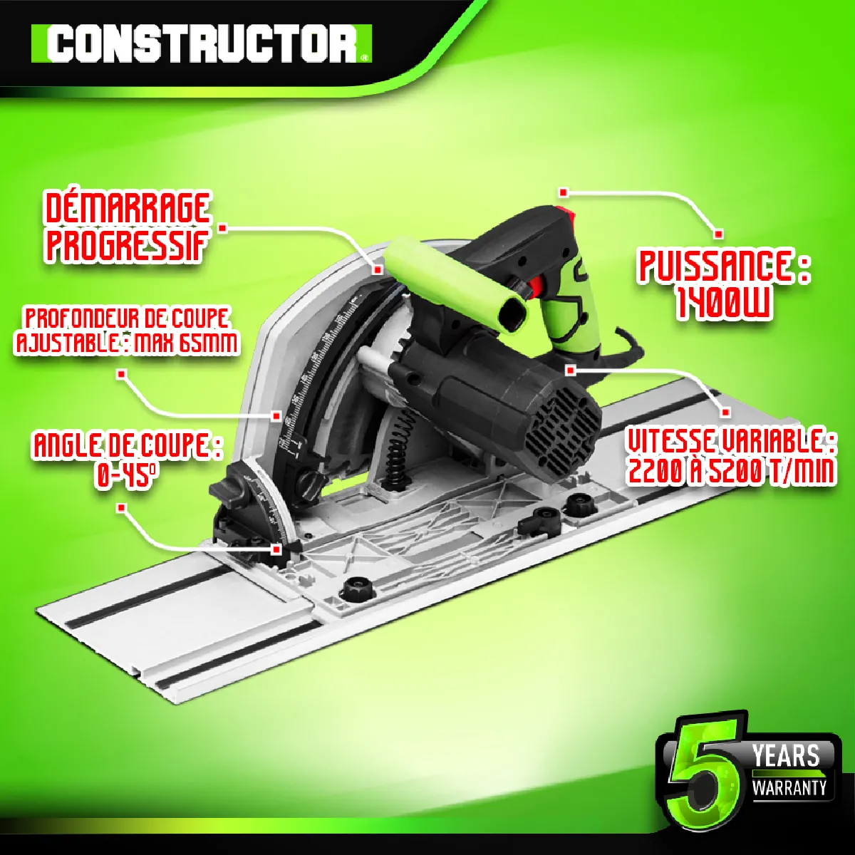 Cette scie circulaire plongeante 1400W de la marque Constructor vous permettra de faire des coupes précises grâce à son démarrage progressif, au système de guidage ( 2 rails en aluminium de 70cm chacun fournis) et au système de plongée progressive.