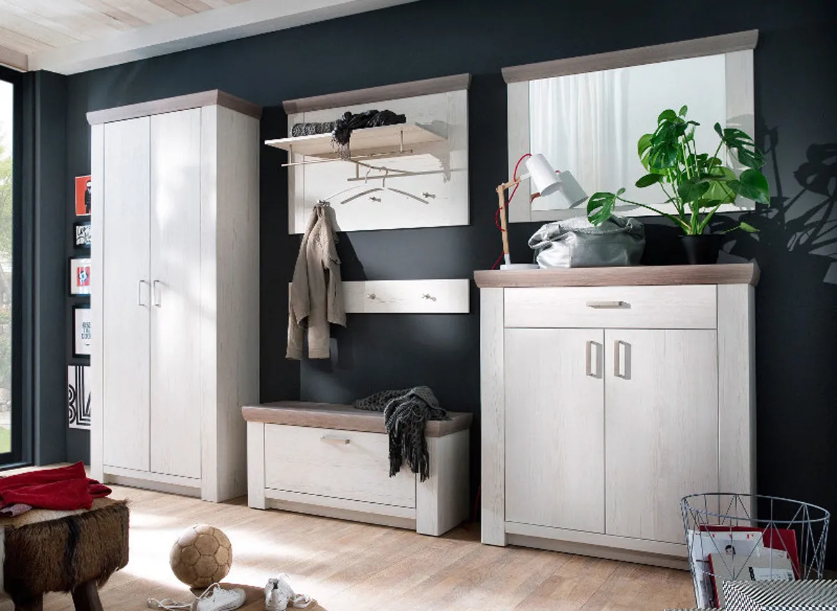 Ensemble d'entrée en pin - 5 meubles assortis - décor chêne - coloris blanc