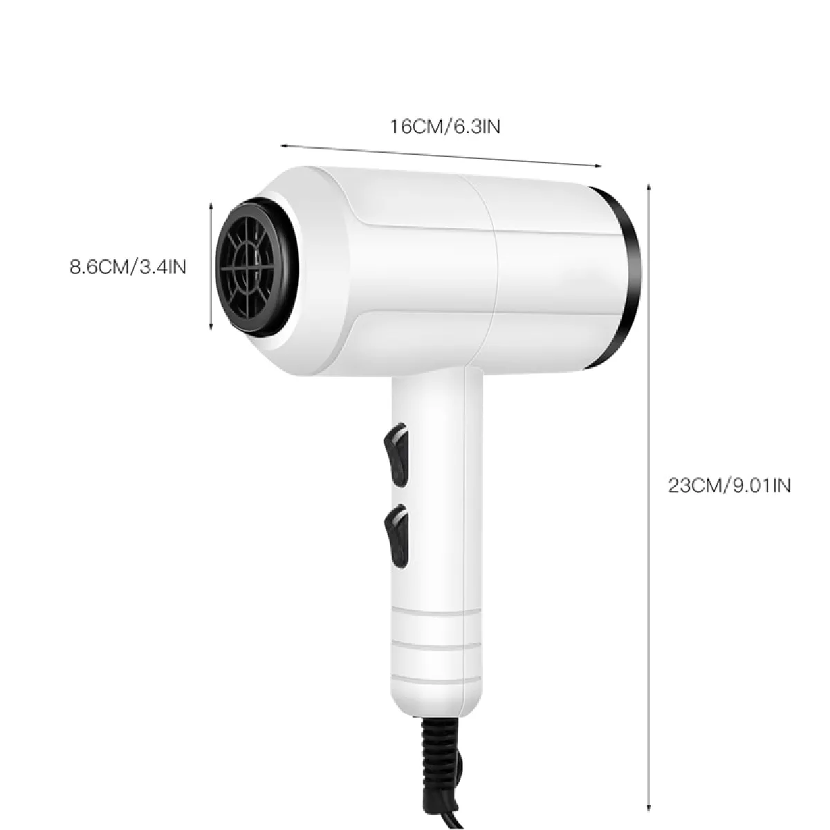 Avec son format mini et son poids d'environ 0,299 kg, ce sèche-cheveux se glisse aisément dans un sac de sport ou un bagage cabine. Le câble d'environ 1,5 m offre une liberté de mouvement suffisante devant le miroir. Le corps en ABS allie légèreté et résistance pour un usage fréquent, tandis que la couleur blanche sobre s'intègre facilement dans une salle de bain familiale ou un hébergement temporaire.