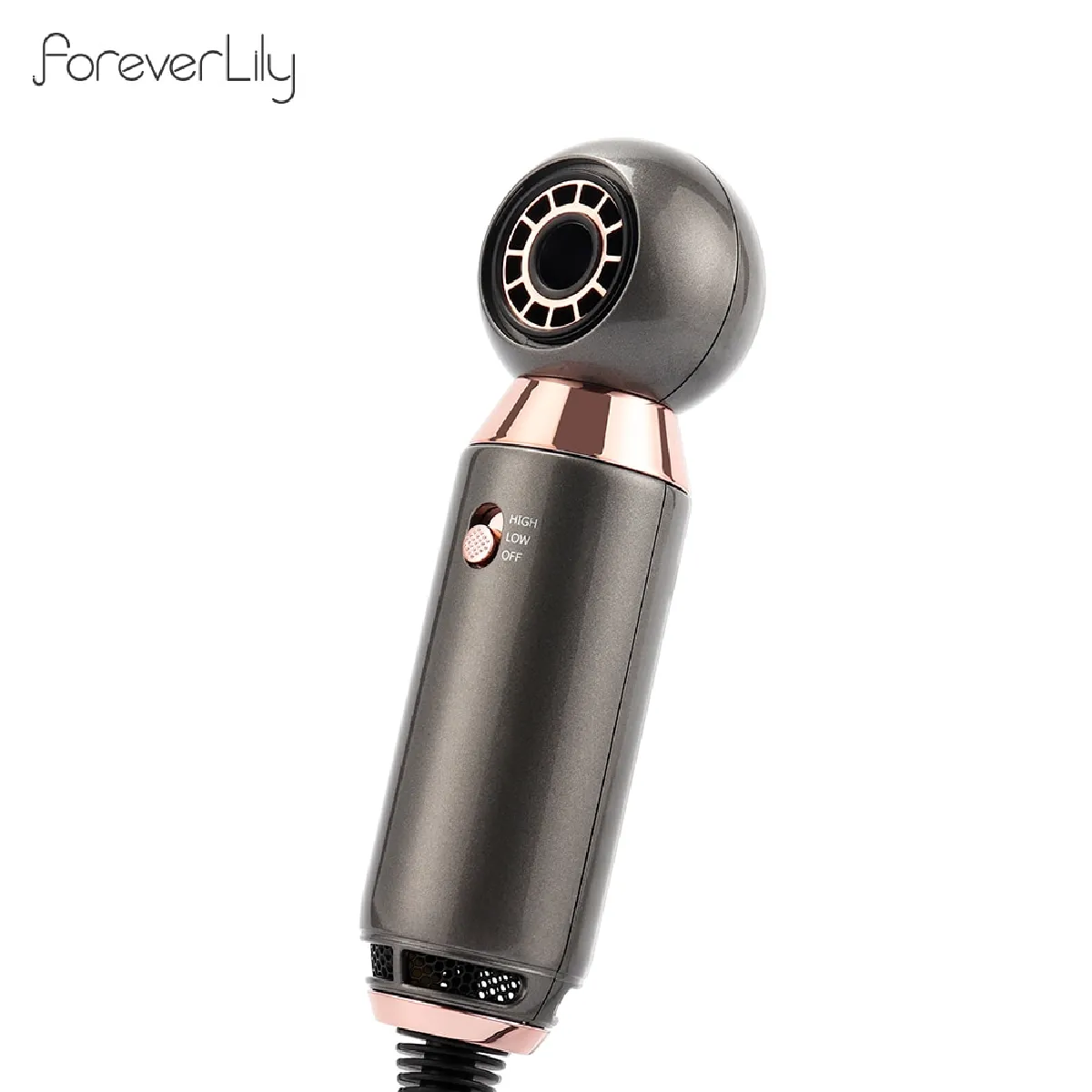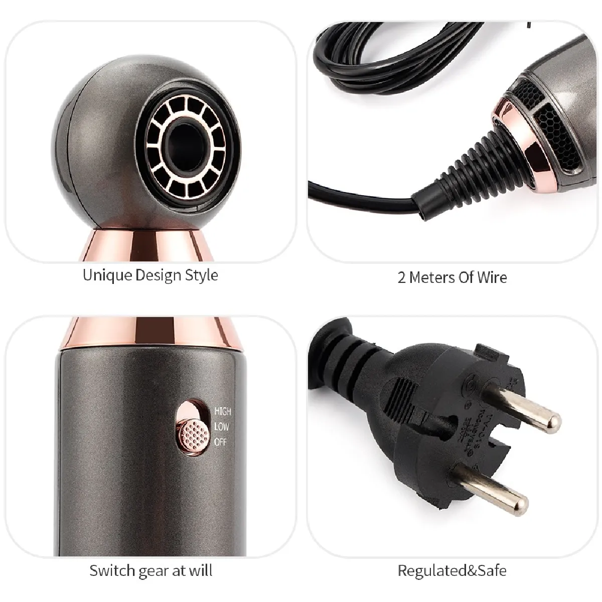 Son poids de 365 g et sa taille compacte 5 × 20 cm favorisent un maniement aisé, notamment lors des séchages à bout de bras. Le cordon d'environ 2 m offre une amplitude confortable autour du miroir sans tirer sur l'appareil. L'interrupteur à 2 niveaux permet un réglage direct du souffle selon la zone à travailler ou le temps disponible. Grâce à l'alimentation multi-tension 110-125 V / 220-240 V, il est utilisable dans différentes régions avec l'adaptateur de prise approprié.