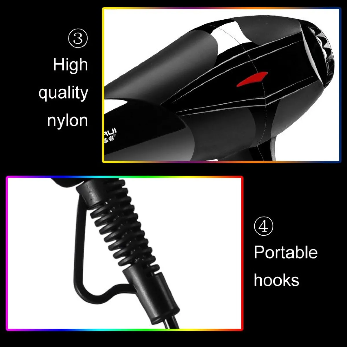 Le format filaire assure une alimentation stable en 240 V pour tirer parti de la puissance annoncée. Avec 0,5 kg, la prise en main reste maîtrisée pour des gestes répétés. La présence d'air chaud et air froid élargit les usages : séchage rapide, lissage avec brosse ou refroidissement final. La coquille en matériau de bonne qualité et la couche interne décrite comme résistante aux flammes visent une structure robuste. Ces choix de conception soutiennent un fonctionnement prolongé dans un salon de coiffure ou à la maison, tout en restant simples à entretenir grâce au capot amovible.