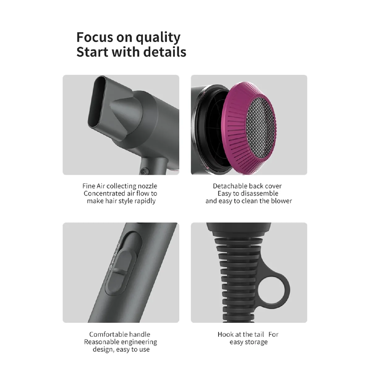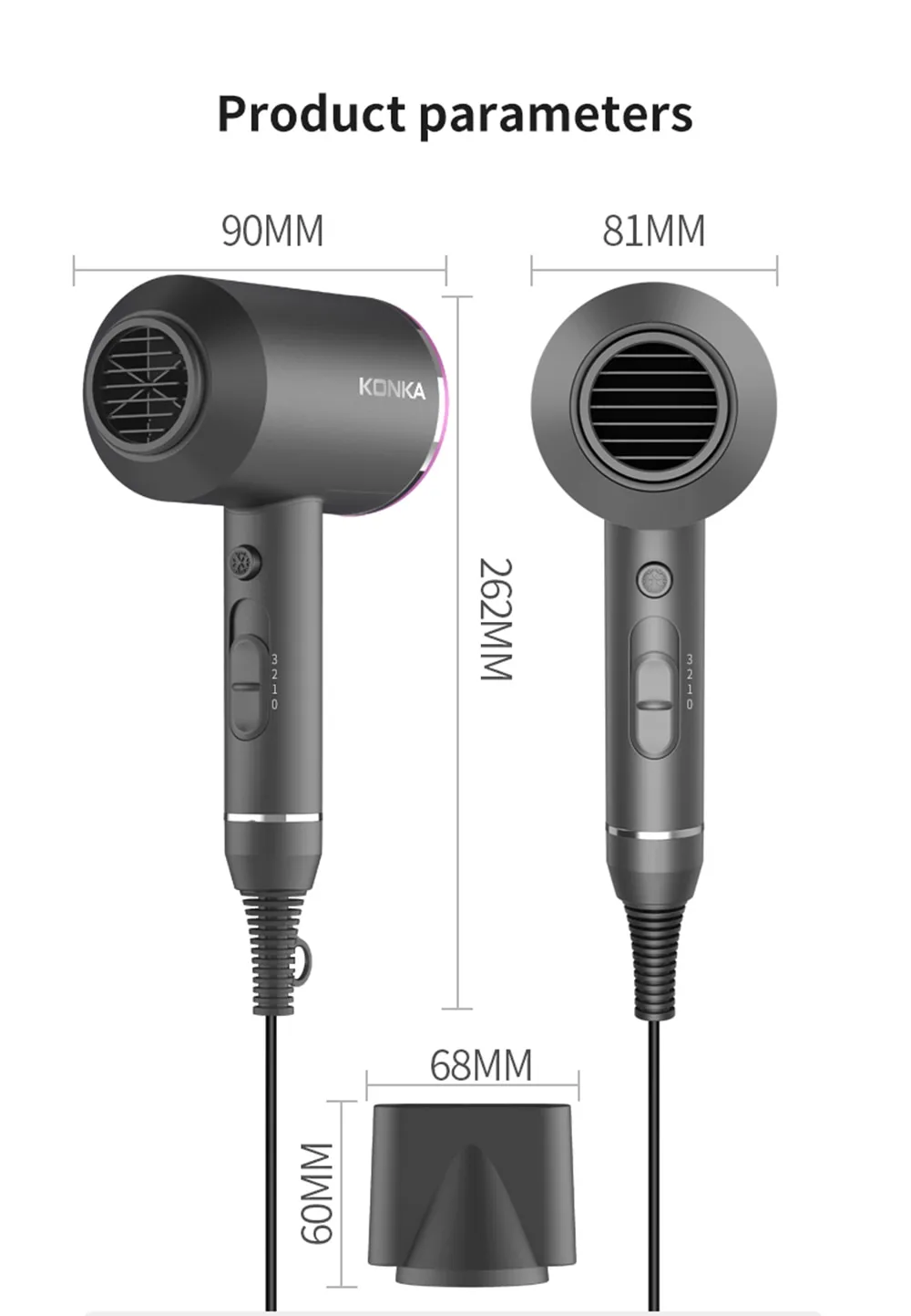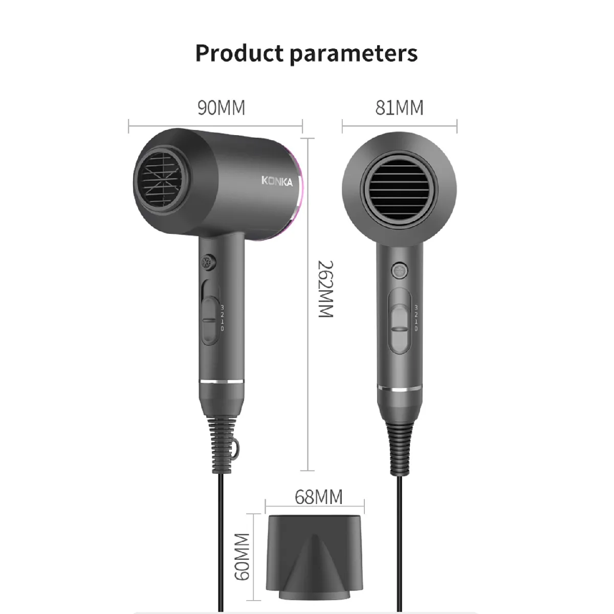 Conçu pour un usage régulier, l'appareil présente une prise en main pensée pour un bon équilibre du poids et une utilisation plus silencieuse. Le câble professionnel de 2,5 m facilite les mouvements autour de la coiffeuse sans traction excessive. Le coloris gris foncé s'accorde facilement avec un espace bain contemporain et reste discret au rangement. La structure vise un bon maintien en main pour orienter précisément la buse selon la mèche travaillée.