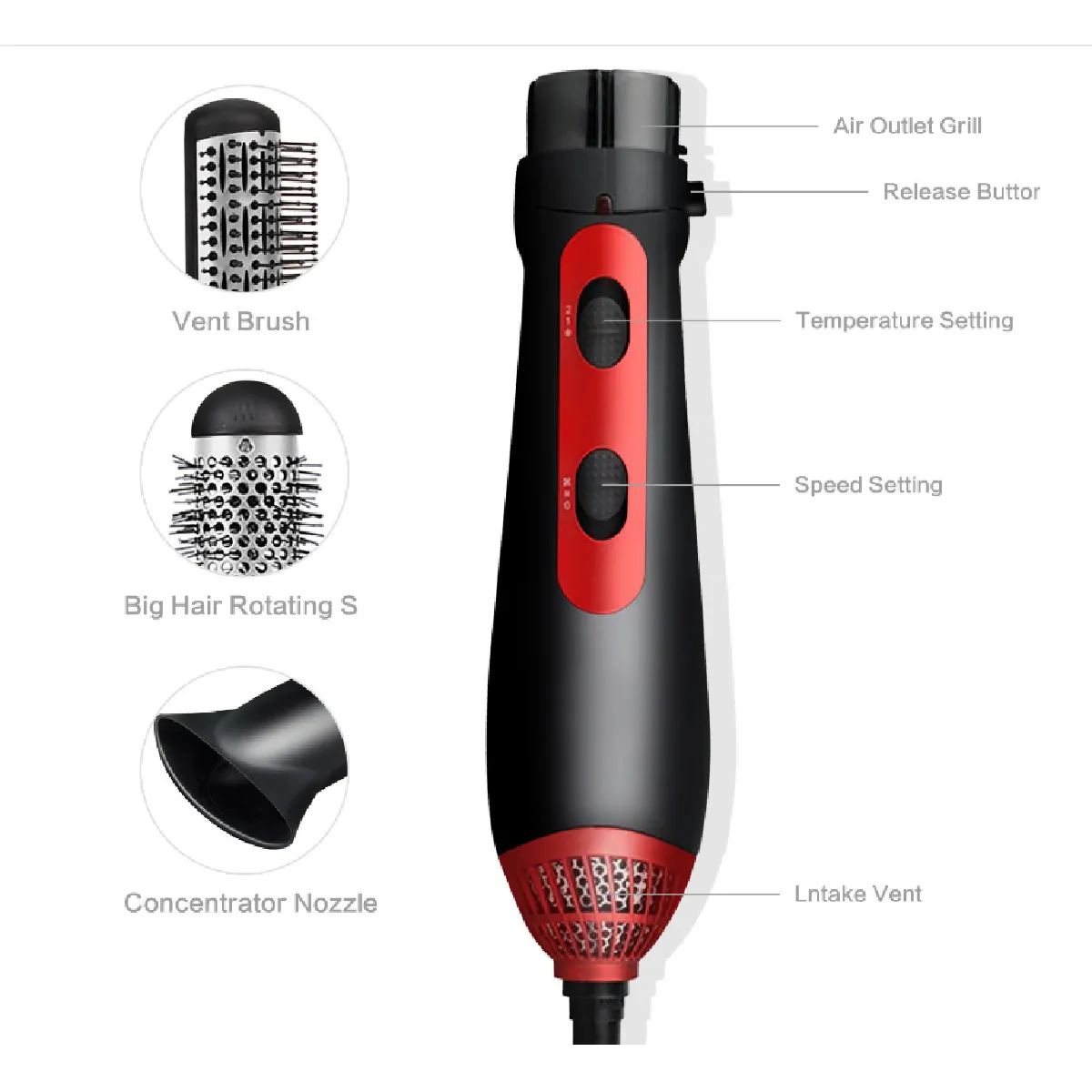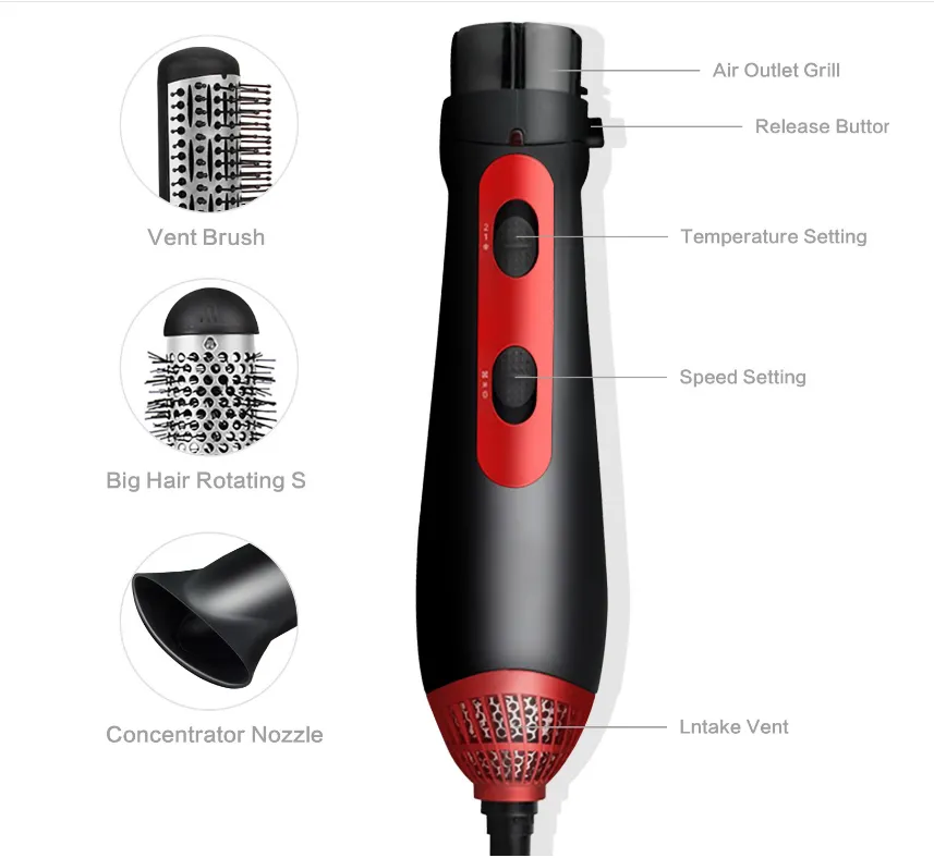 Pensée pour la routine capillaire, la structure légère de 489 g limite la fatigue du poignet pendant les séances de brushing. La combinaison de deux réglages de température et de deux vitesses apporte une gestion simple des étapes de séchage et de finition. La couleur rouge offre une visibilité immédiate parmi les accessoires de salle de bain, tandis que le format unique 3 en 1 évite d'alterner entre plusieurs appareils, ce qui favorise une organisation plus compacte de l'espace.