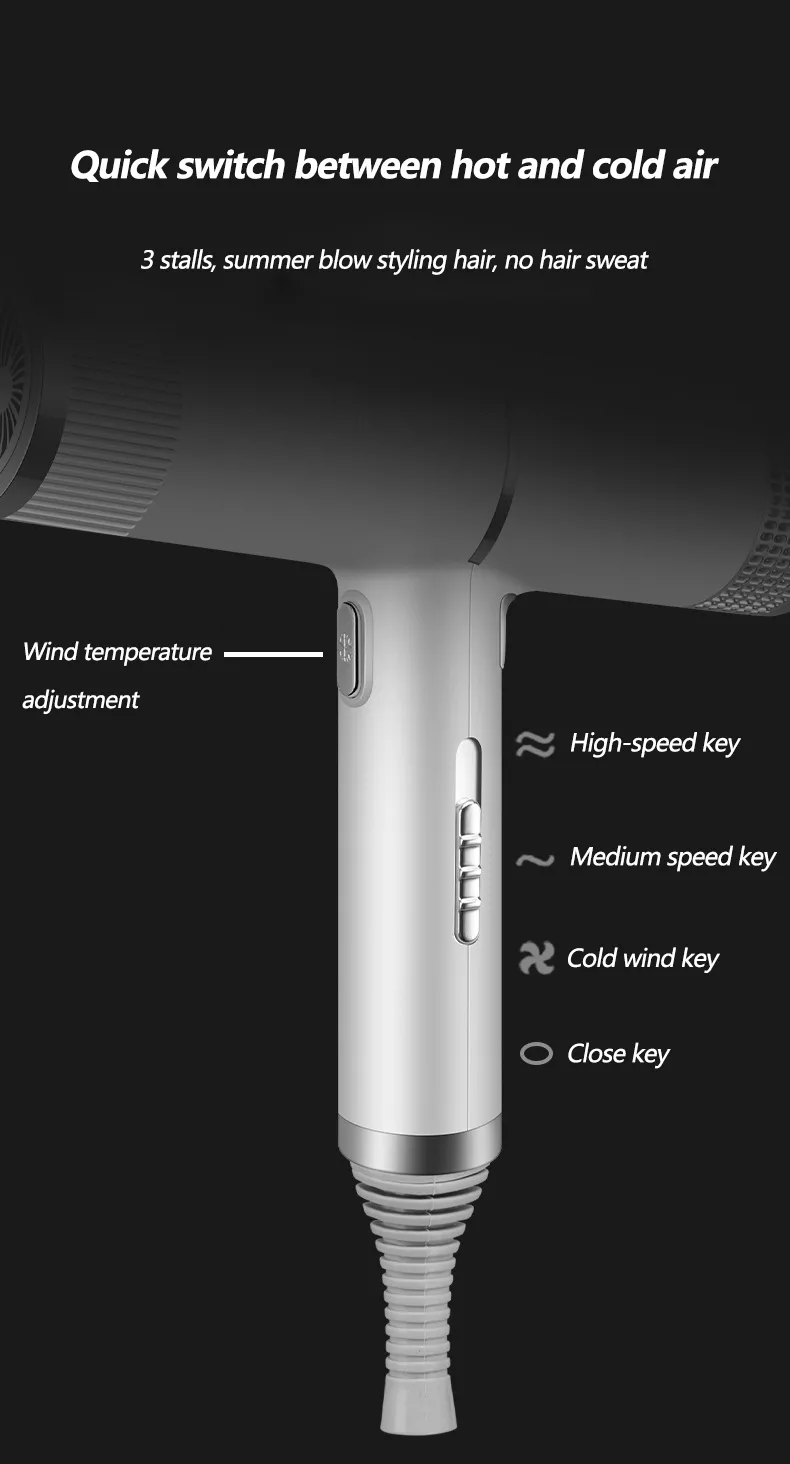 Le niveau sonore de 70 à 80 dB s'inscrit dans une plage typique d'un appareil domestique, tout en préservant une bonne efficacité de soufflage. Avec une puissance de 1000 W, la chaleur reste maîtrisée pour un usage régulier sans excès. La protection contre la surchauffe et le contrôle thermique coupent l'alimentation en cas d'élévation anormale de température. Le cordon filaire assure une alimentation stable, et le format 20 x 24,5 cm reste pratique à manipuler et à ranger dans un tiroir de salle de bain.