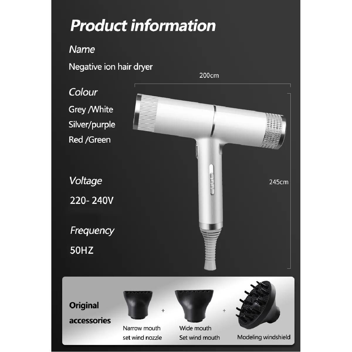- Alimentation : filaire, 220 V - 240 V, 50 Hz - 60 Hz