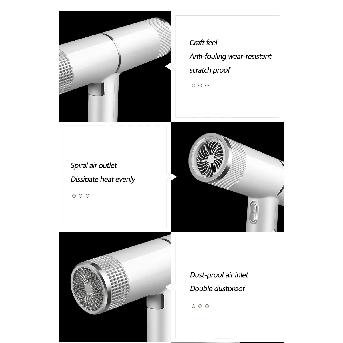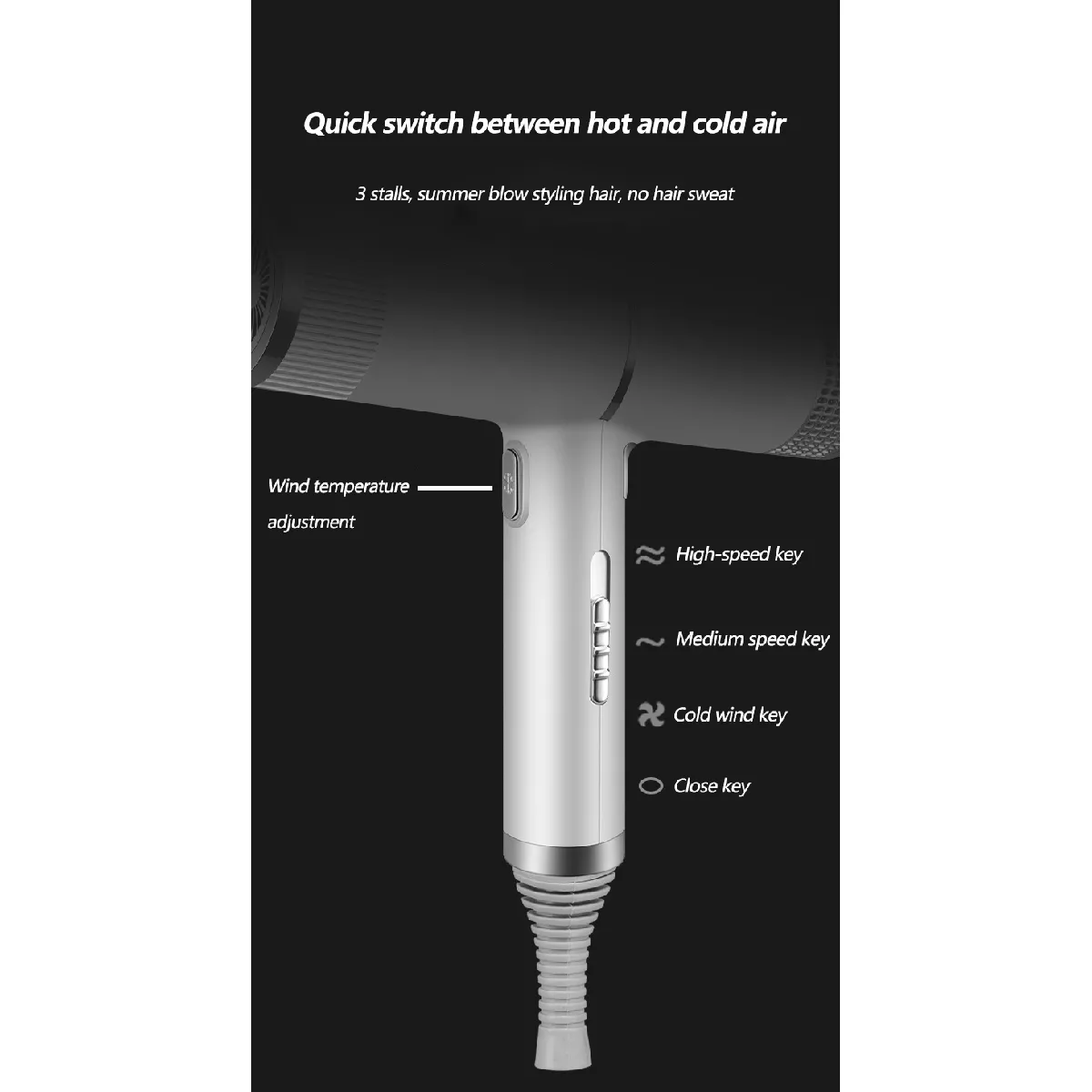 - Réglages : 3 vitesses et 3 températures