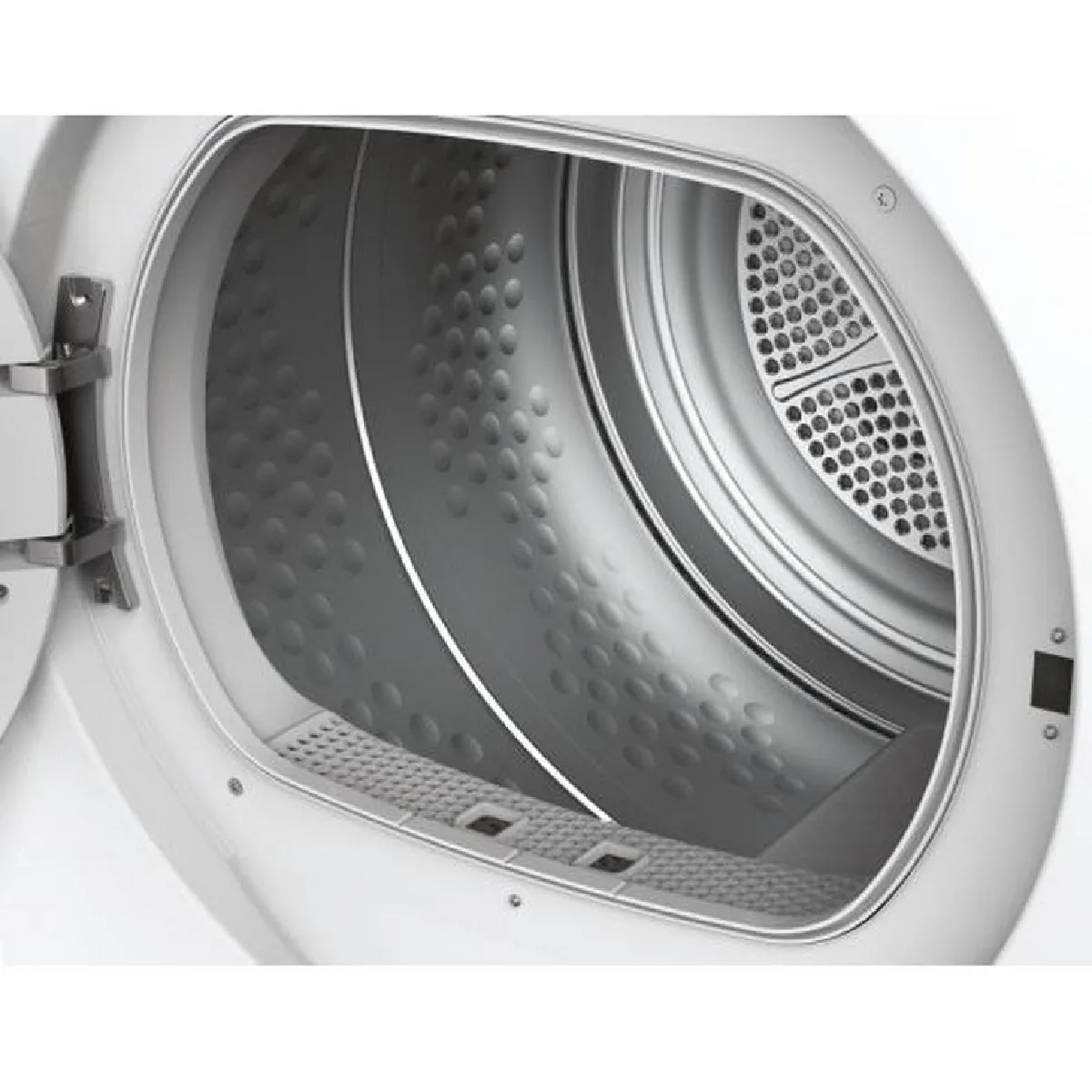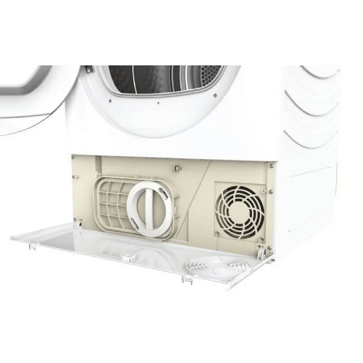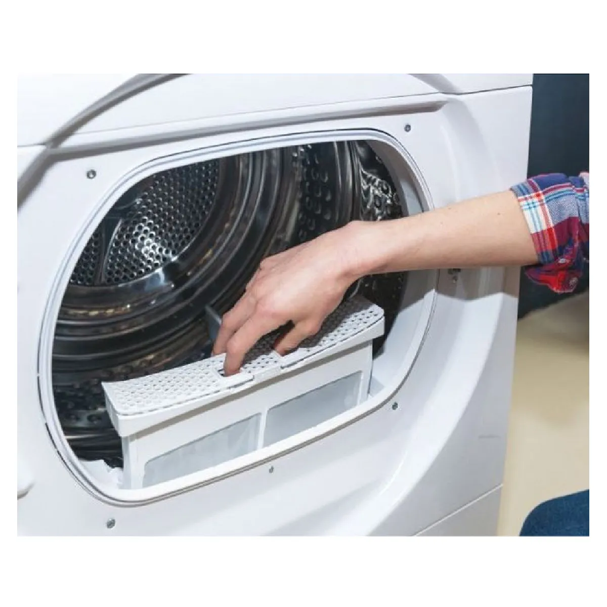 Le filtre 2 en 1 situé dans la porte limite les manipulations et évite un double nettoyage. Le bac récupérateur d'eau Easy Case, intégré à la porte, se transporte et se vide facilement avec contrôle du niveau d'un simple regard. L'appareil en pose libre s'intègre dans les buanderies et cuisines grâce à ses dimensions de 85 x 59.6 x 58.5 cm. Le chargement frontal par hublot facilite l'accès au tambour de 125 l, pratique pour les couettes et draps. La mise sous tension dédiée et le programmateur électronique apportent une navigation directe et lisible.