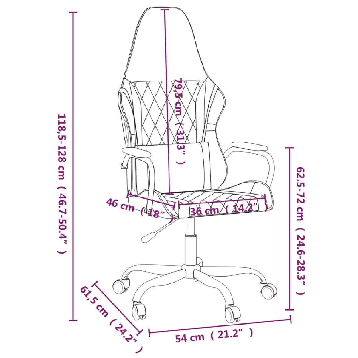- Hauteur des accoudoirs à partir du sol : 62,5-72 cm