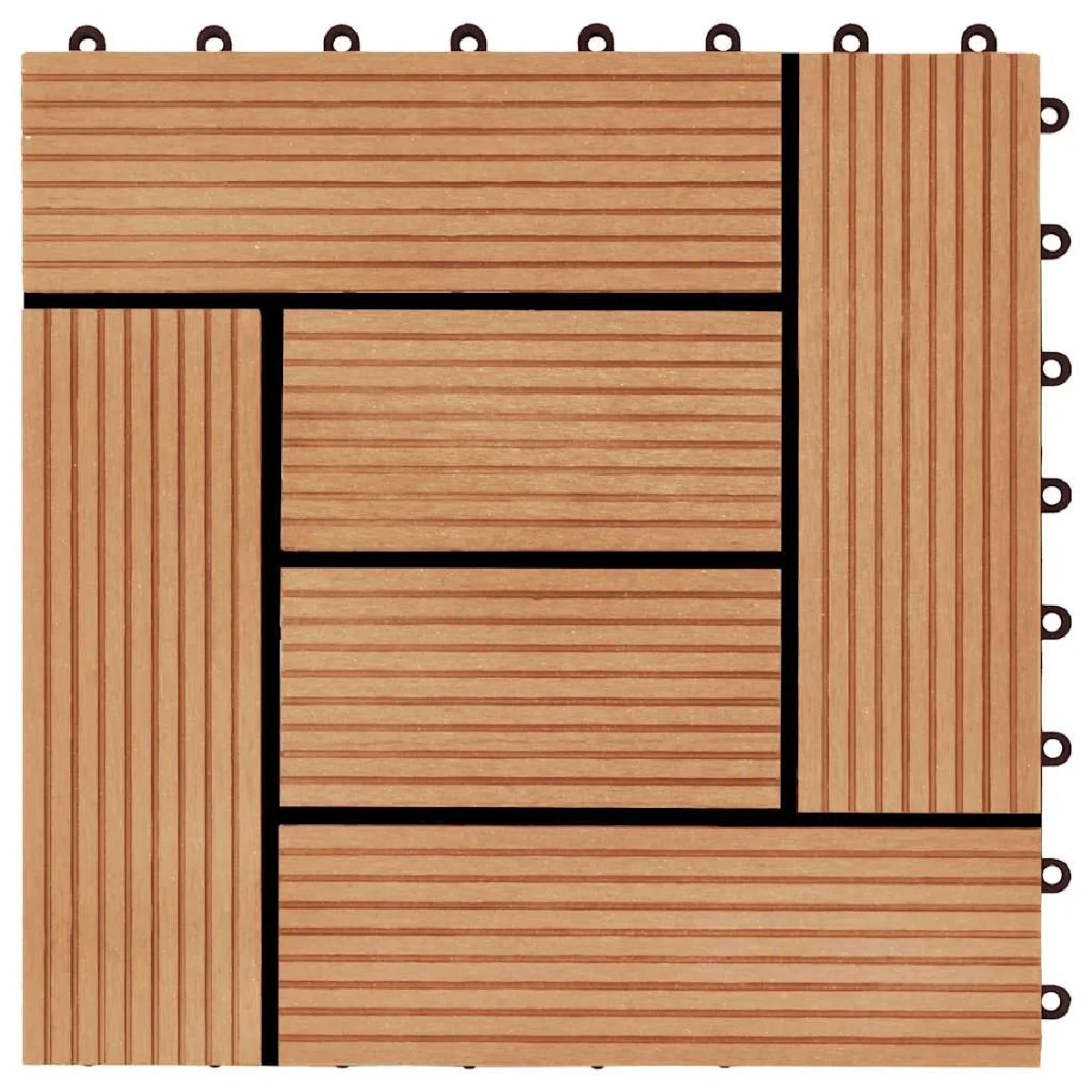 Cet ensemble de carreaux de terrasse WPC, d'une taille individuelle de 30 x 30 cm, se compose de 11 pièces et couvre une surface totale d'un mètre carré. Il sera parfait pour les patios, les balcons, les salles de bains, ou votre piscine ou spa.
