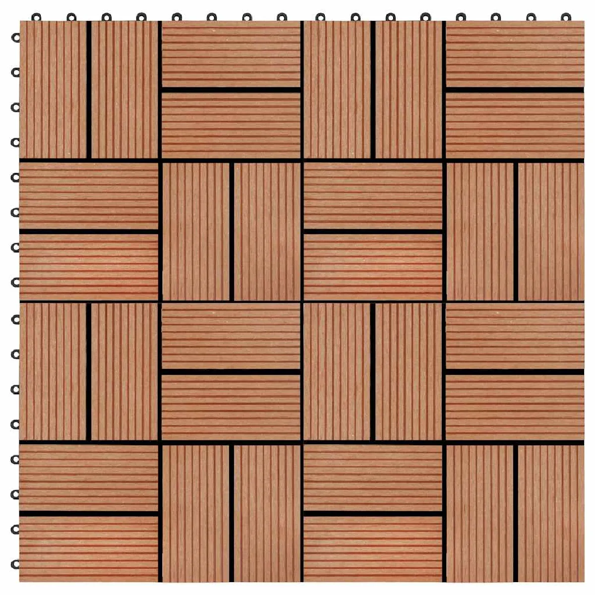 Cet ensemble de carreaux de terrasse WPC, d'une taille individuelle de 30 x 30 cm, se compose de 11 pièces et couvre une surface totale d'un mètre carré. Il sera parfait pour les patios, les balcons, les salles de bains, ou votre piscine ou spa.