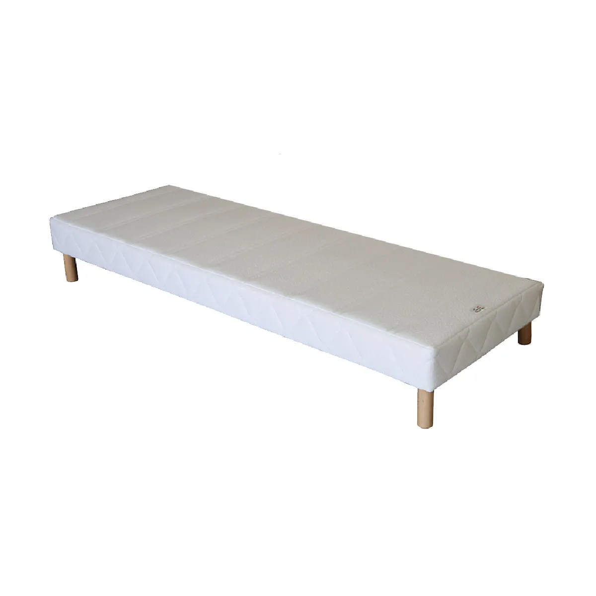 La structure en bois massif avec masses d'angle pour pieds 8 mm assure une base solide et fiable. Les lattes multiplis, montées sur embouts, répartissent la charge afin de limiter les zones d'affaissement et d'optimiser la durée d'usage du matelas. La toile de fond anti poussière protège l'intérieur du sommier contre les particules, pour un couchage plus propre et un entretien simplifié. Le garnissage en ouate anallergique sous coutil de finition apporte une surface de contact régulière, compatible avec un large éventail de matelas.