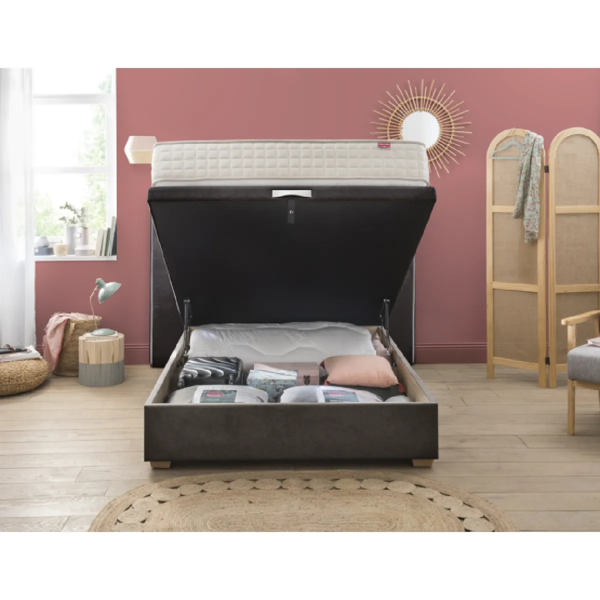 - Solide et pratique : offre une grande capacité de rangement, structure robuste et solide, ouverture du sommier sans effort et maintien du matelas lors de l'ouverture