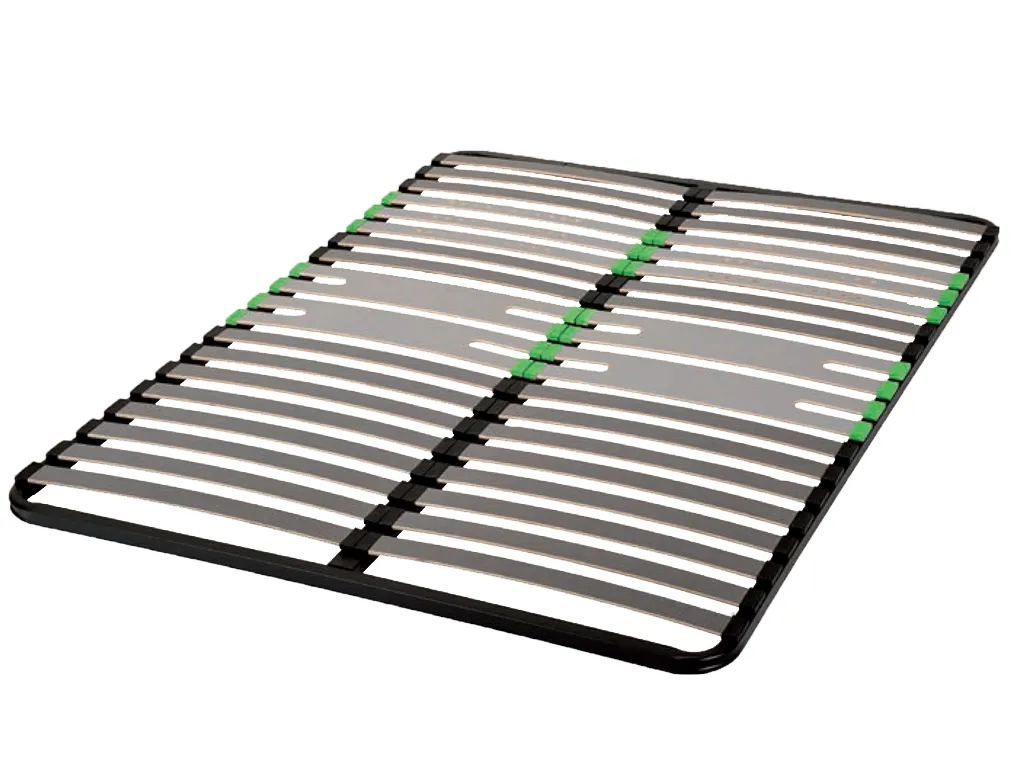 La combinaison de lattes 53 mm et de deux lattes larges 141 mm répartit les points d'appui pour un maintien homogène sur toute la surface. Les embouts en polyéthylène noir et vert pour la fixation des lattes réduisent les bruits et facilitent les micro-mouvements du couchage. L'épaisseur totale de 4,5 cm pour le cadre complet permet une intégration facile dans la plupart des cadres de lit, tout en conservant la rigidité nécessaire à une bonne stabilité.