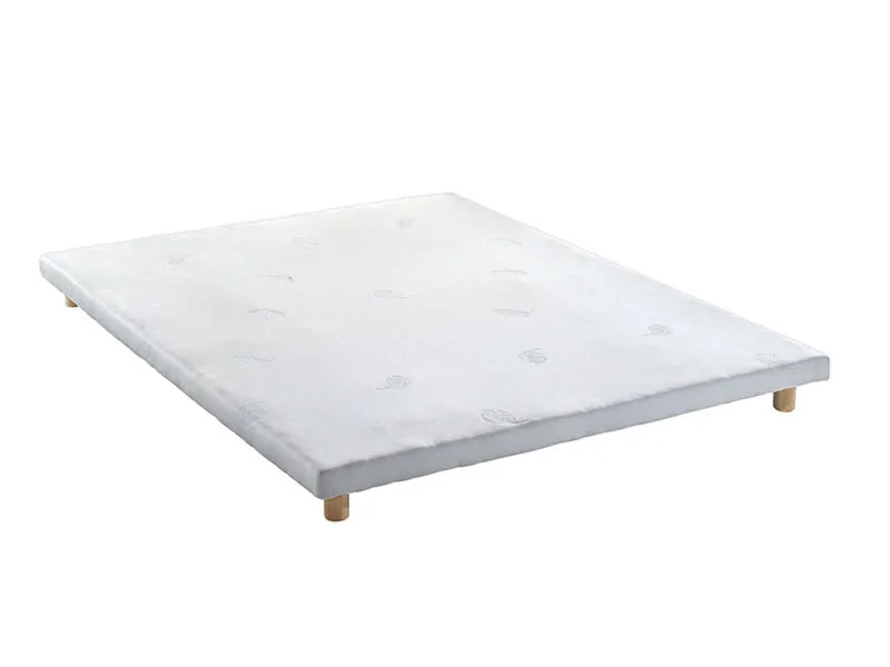 Une nappe de feutre aiguilleté 1500 g/m2 sous le tissu 100 % polyester constitue une couche d'appui qui favorise la longévité du matelas. La toile de fond anti poussière préserve le dessous du sommier et limite l'accumulation d'impuretés. Les 4 masses d'angle avec filetage 8 mm permettent l'installation de pieds compatibles, ou l'insertion dans un cadre de lit selon l'agencement souhaité. Le sommier est livré sans pieds, compatibles jusqu'à 55 mm de diamètre.