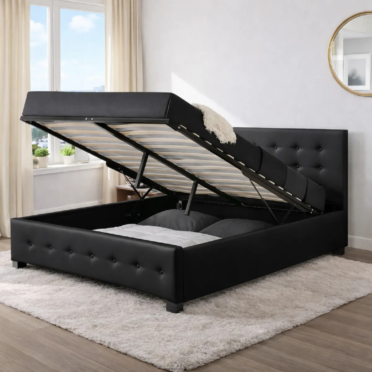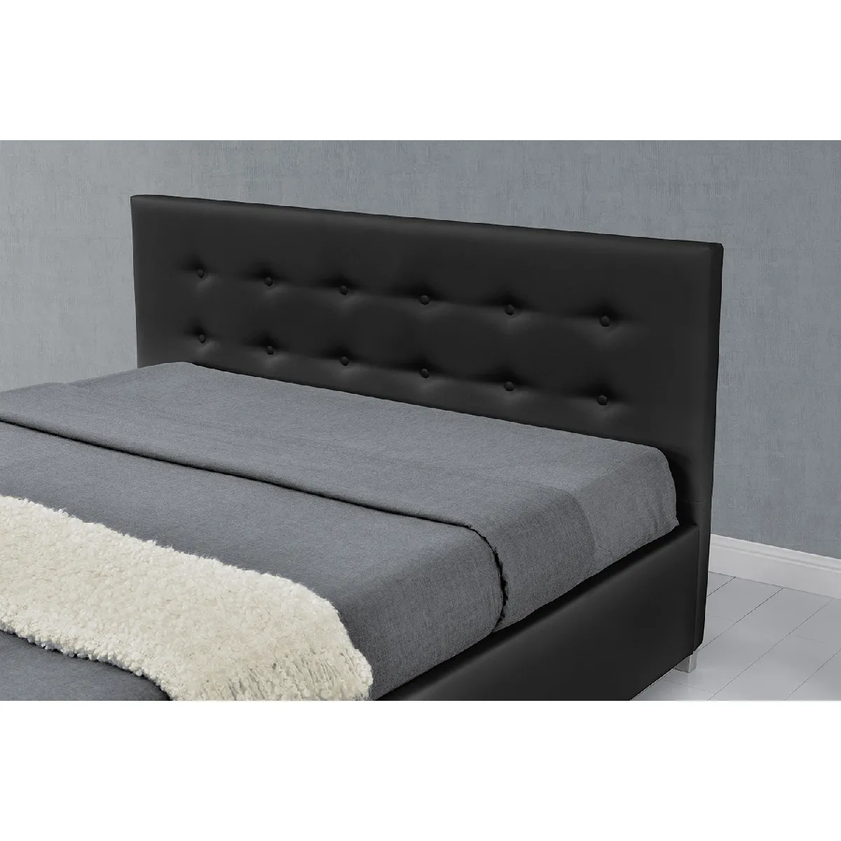 Lit deux places capitonné - Coffre de rangement - Simili PU - Lattes bois