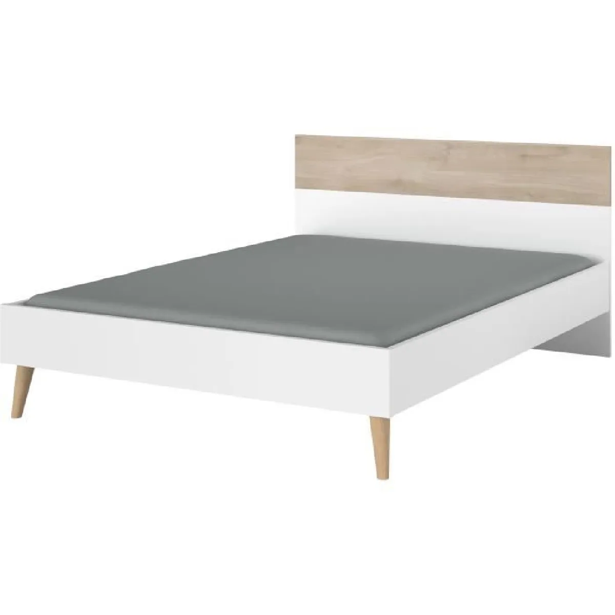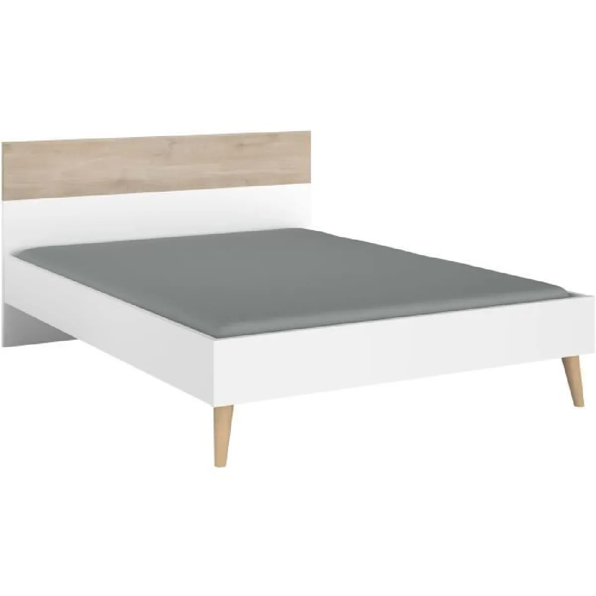 Lit double blanc et imitation chêne - Design scandinave - Piétement en chêne massif - Fabrication française