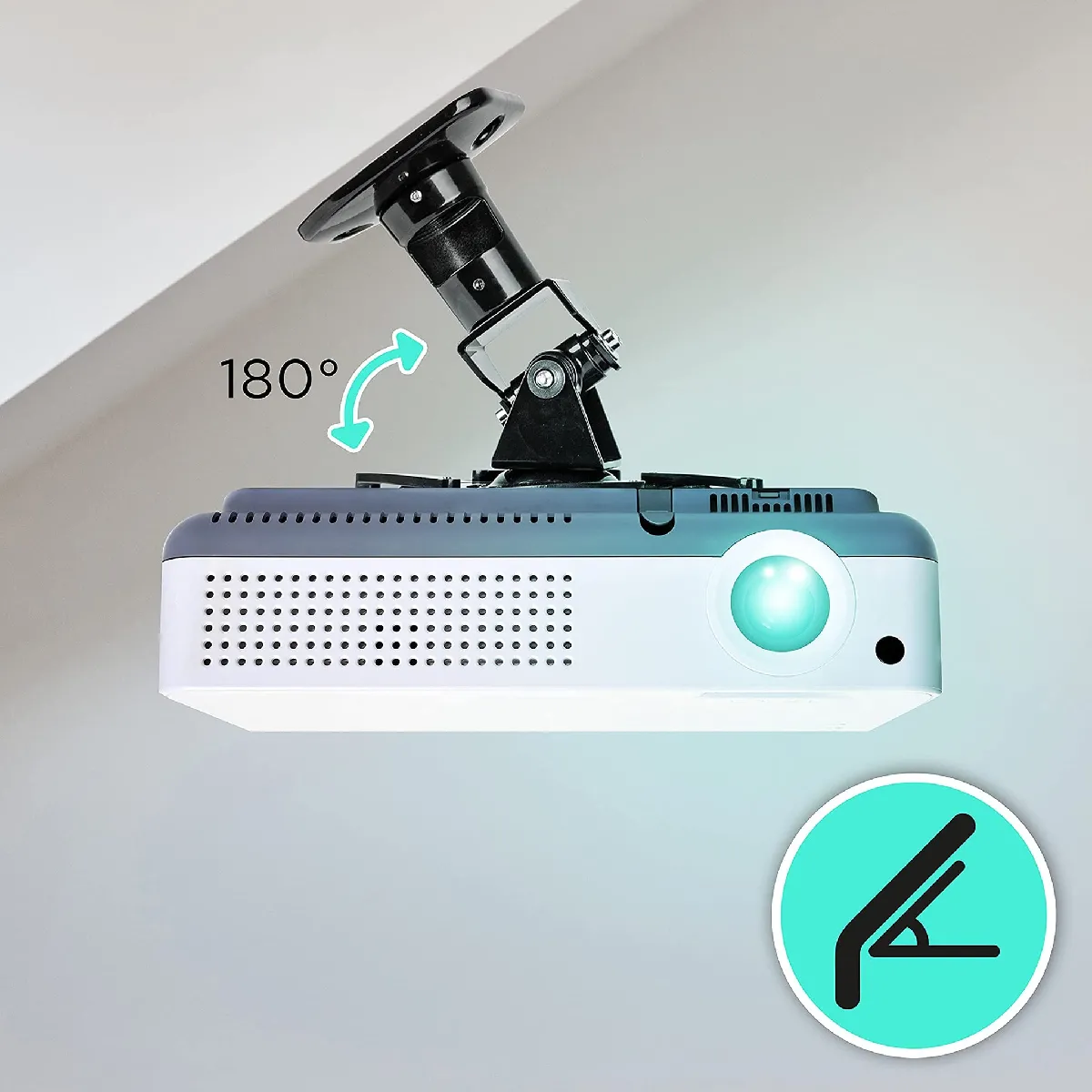 La tête articulée propose une plage d'inclinaison de haut en bas à 180° et un pivot gauche-droite à 180° pour aligner l'image avec l'écran sans contrainte. La rotation sur 360° permet un ajustement fin lors du cadrage, utile pour corriger de légers décalages de position. La hauteur fixe de 218 mm réduit l'ombre portée et optimise la ventilation autour de l'appareil. Une fois fixé, l'ensemble reste stable pour des projections prolongées.