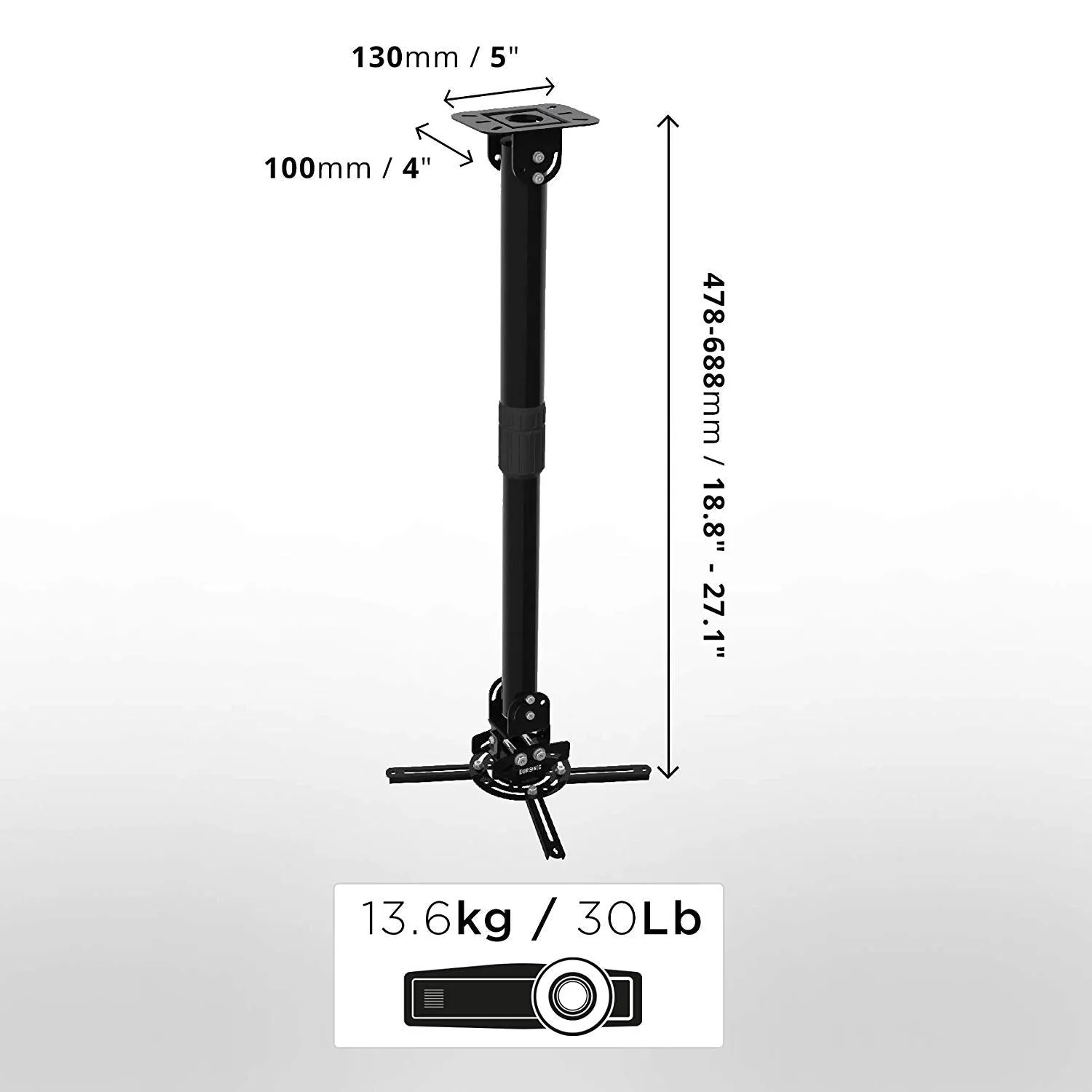 - Montage mural ou plafond avec bras télescopique 450 à 700 mm