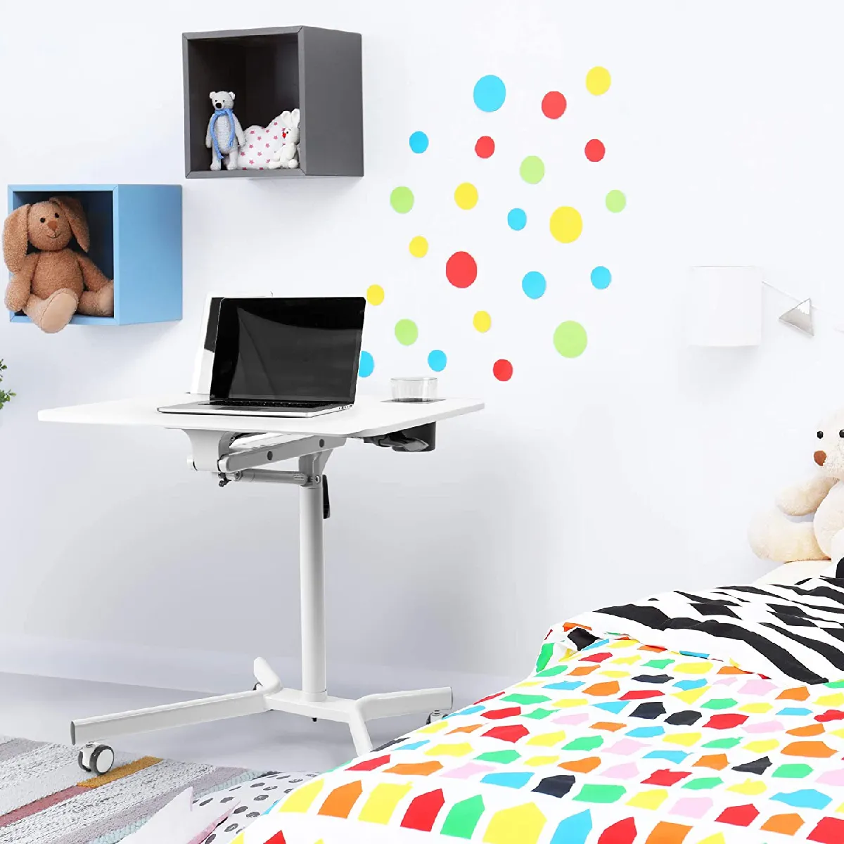 Le plateau large offre une surface de 70 x 52 cm pour ordinateur portable, documents et vidéoprojecteur, idéale pour varier les usages à la maison ou au bureau. La structure mobile sur roulettes facilite les déplacements d'une pièce à l'autre, tandis que la hauteur ajustable de 72 à 105 cm permet d'alterner aisément entre position assise et debout. Un logement dédié accueille le smartphone ou la tablette pour garder les informations à portée de vue, et un porte-gobelet limite les risques d'incident. La base en acier de couleur blanche, associée à une plateforme en MDF, assure une stabilité fiable pour des configurations polyvalentes.