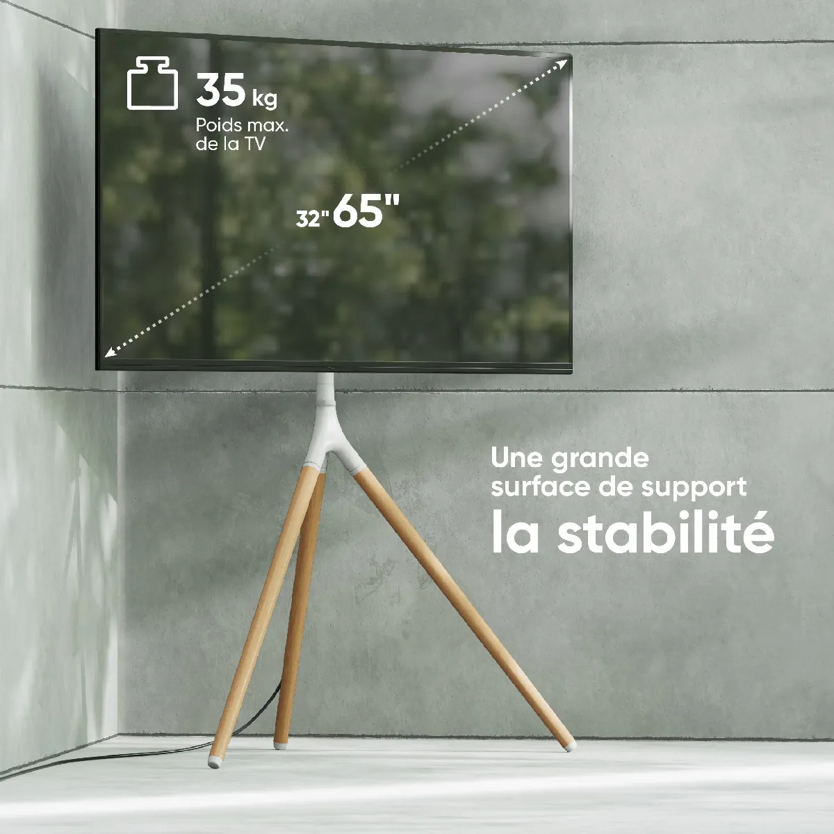 SUPPORT PIED TV BLANC | Trepied bois TV est de petite taille qui vous permettra de le placer dans aucun lieu en chamber | Support trépied pour TV peut vous servir comme un accessoire élégant et TV portable sur pied sans fil | Avec le support television sur pied câble supplémentaire de sécurité garantit dexclure une tombée accidentelle de TV et de protéger vos enfants et animaux domestiques