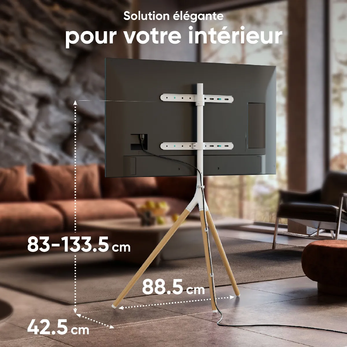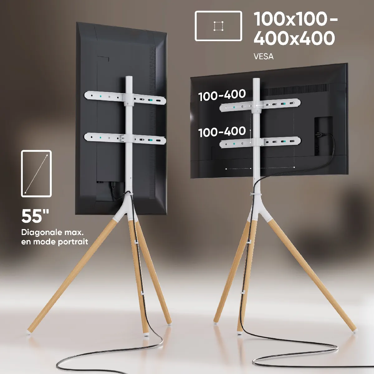 TREPIED SUPPORT TV SANS PERCER | Pivoter le trepied TV pivotant à 360° et varier l'angle de vision | Fixez l'ecran sur le pied de television avec VESA 100x100 - VESA 400x400 au format paysage ou portrait | PIED universel pour TV est fait en bois et acier durable | Kit de support tele pied bois comprend les clips pour une propre gestion des cables