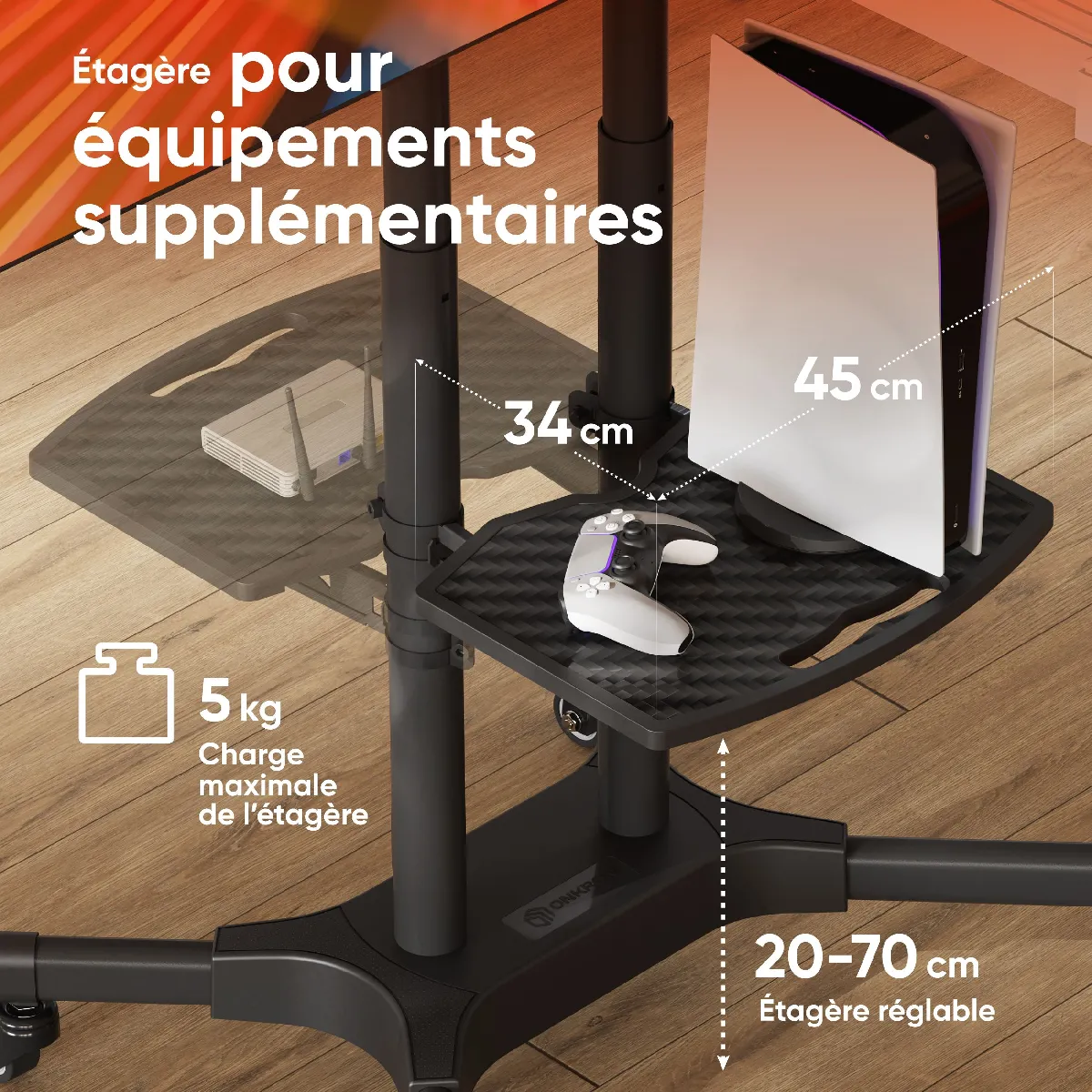 MEUBLE TV AVEC SUPPORT | Chariot TV mobile a une etagere réglable en hauteur qui est fait en plastique & supporte un poids jusqu'à 5 kg | Pied TV roulette a les goulottes de câbles intégrées à support tele sur pied permettent de dissimuler les fils soigneusement | Rafraîchissez votre maison ou votre bureau avec ONKRON support TV roulette